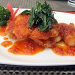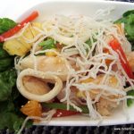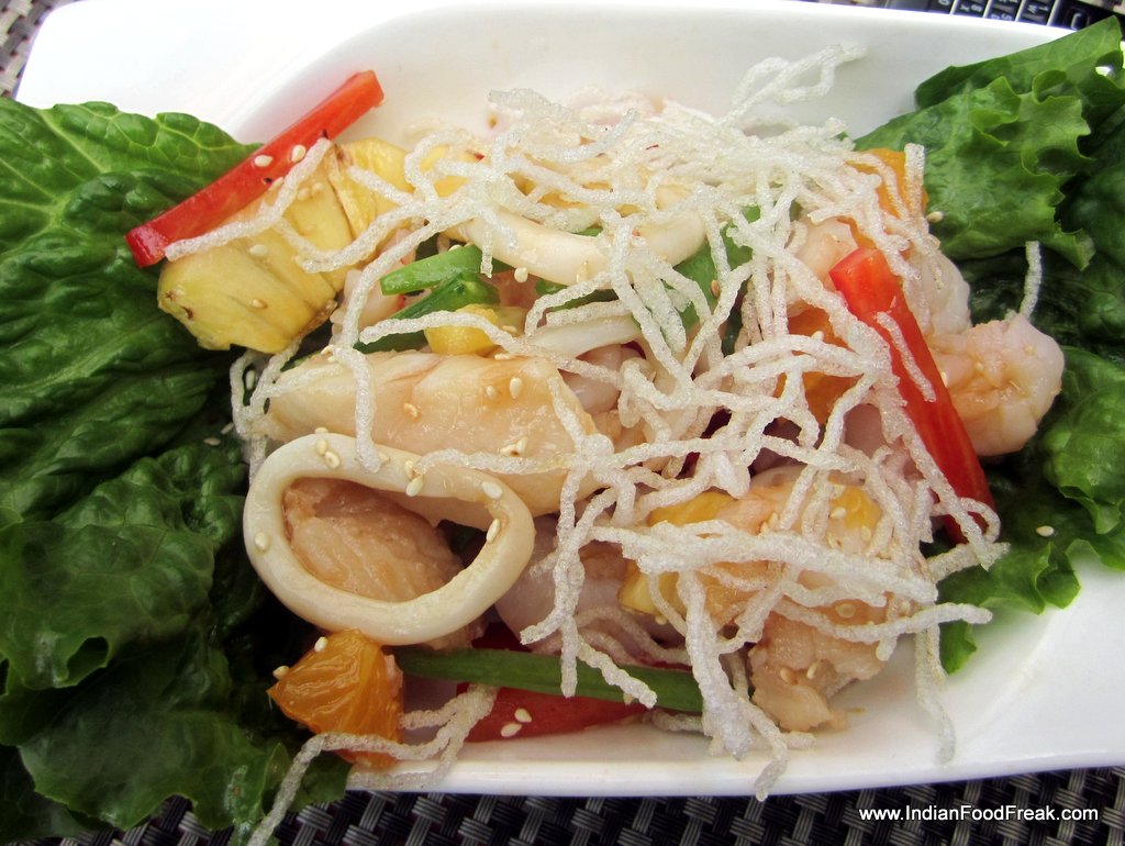 The first dish, a prawn tom yum soup (Rs 215) showcases some of the Chinese chef’s prowess. The soup is flavourful, with the various elements well in balance making it an enjoyable experience. The Polynesian seafood salad (Rs 395) is a fresh yet understated mélange of prawn, squid and basa fish, with a light dressing.
