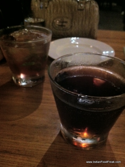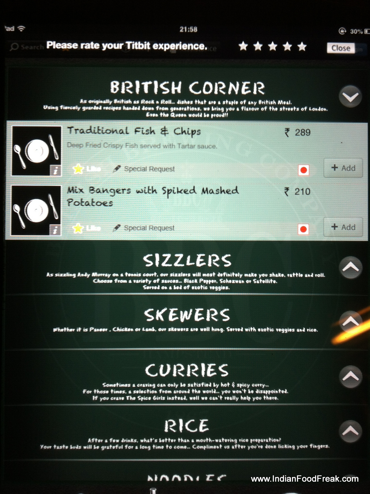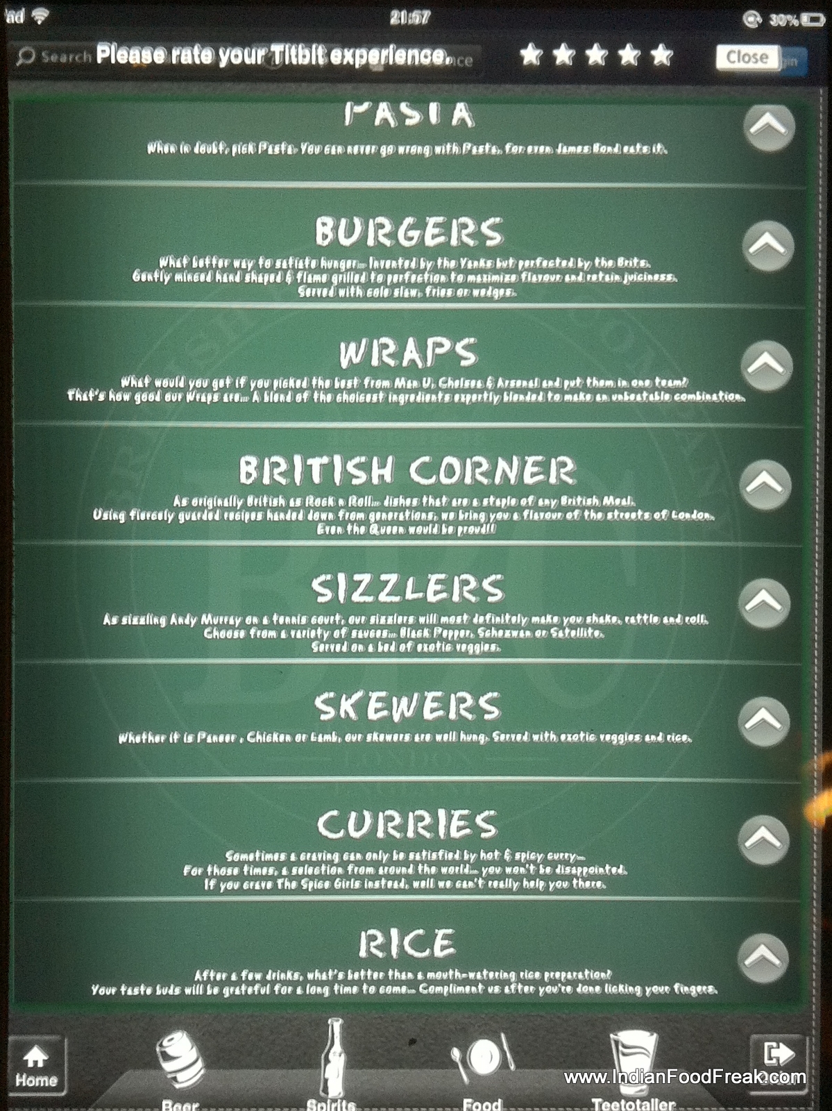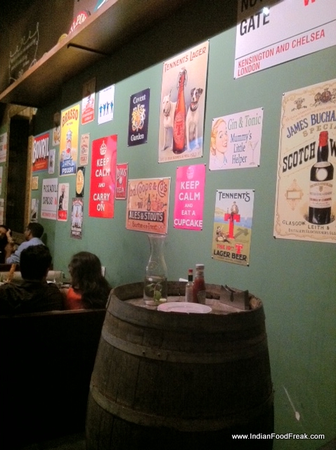 The Pub is setup quite well with wide glass arched windows allowing sweeping view of the dimly lit pub, which was quite busy at 9:00 pm on a Sunday night. Walking up to the front desk was assuring, with a large whiskey cask serving as a manager’s desk and a notepad taking numbers while people waited patiently. A busy place with waiting queue is the first sign of popularity, and 20 minutes did not seem to be out of line. I spent time glancing at the stylish app on an iPad which served as the Menu, and it was quite promising with a wide range of options within sections such as Salads, Curries, Sizzlers, Pastas, Pizzas to the much expected British Fish and Chips. The Menu app is not a passive app, but allows the guests to place orders directly through the app, which is relayed to the waiters carrying iPod Touch devices. It was a modern take on the traditional setting seen in the décor. The place is quite large with seating for at least 80 people in pods and tables spread evenly across the pub. The bar dominates the center of the Pub and is setup with interesting lights and seating, giving an impression of a larger place with a social flair.
