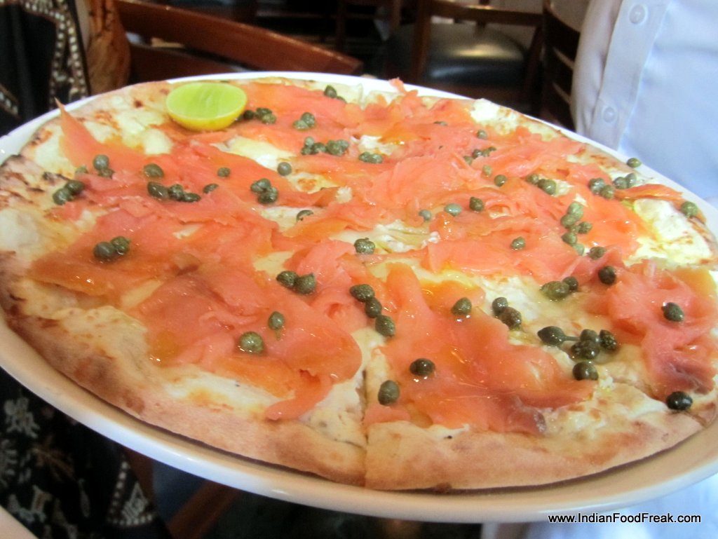 For the pasta course I choose linguine alla aragosta (linguini tossed with tomato sauce and lobster chunks; Rs 1550). The linguine is perfectly cooked al dente, and the lobster chunks are generously provided. Somehow the sauce lacks depth, and because of that, this beautiful dish does not hit the spot. Next I decide to taste the unusual sounding salmone afumicato pizza (Rs 1250) with fresh ricotta, cream cheese, dill, topped with smoked salmon and served with lemon and organic capers. The pizza is really addictive. Devoid of any tomato based sauce, it is a medley of textures. The soft texture of the ricotta and the cream cheese contrasts well with the smoky saltiness of the salmon and dill. Add to it the thin yet flaky crust and the freshness of capers, there is no way I can stop at just one slice.