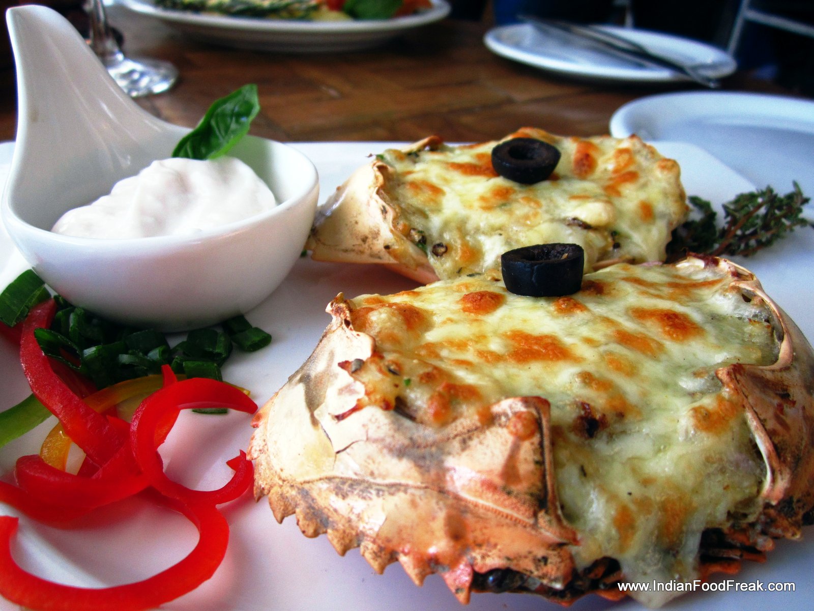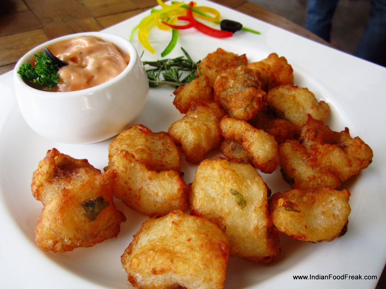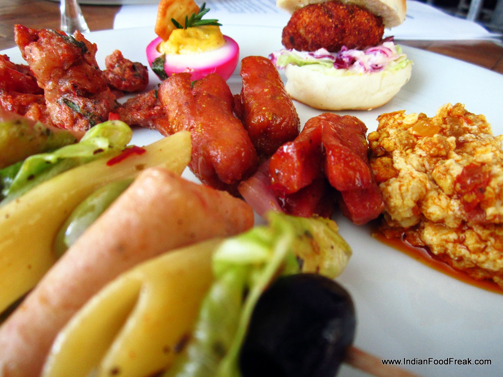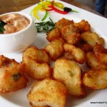 Bombil FrittoWe decided to skip breakfast, and jump to nibble on Bombil Fritto (Bombay Duck fried in the Italian style) and Shrimp stuffed with jalapenos and wrapped with bacon and cheese. I know, it sounds yummy. Believe me, it tastes nothing less. While the Bombil was hidden under a crisp coating of breadcrumbs, the bacon around the shrimp was hot and smoky and our wine based drinks well balanced with the flavour of fruits.