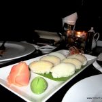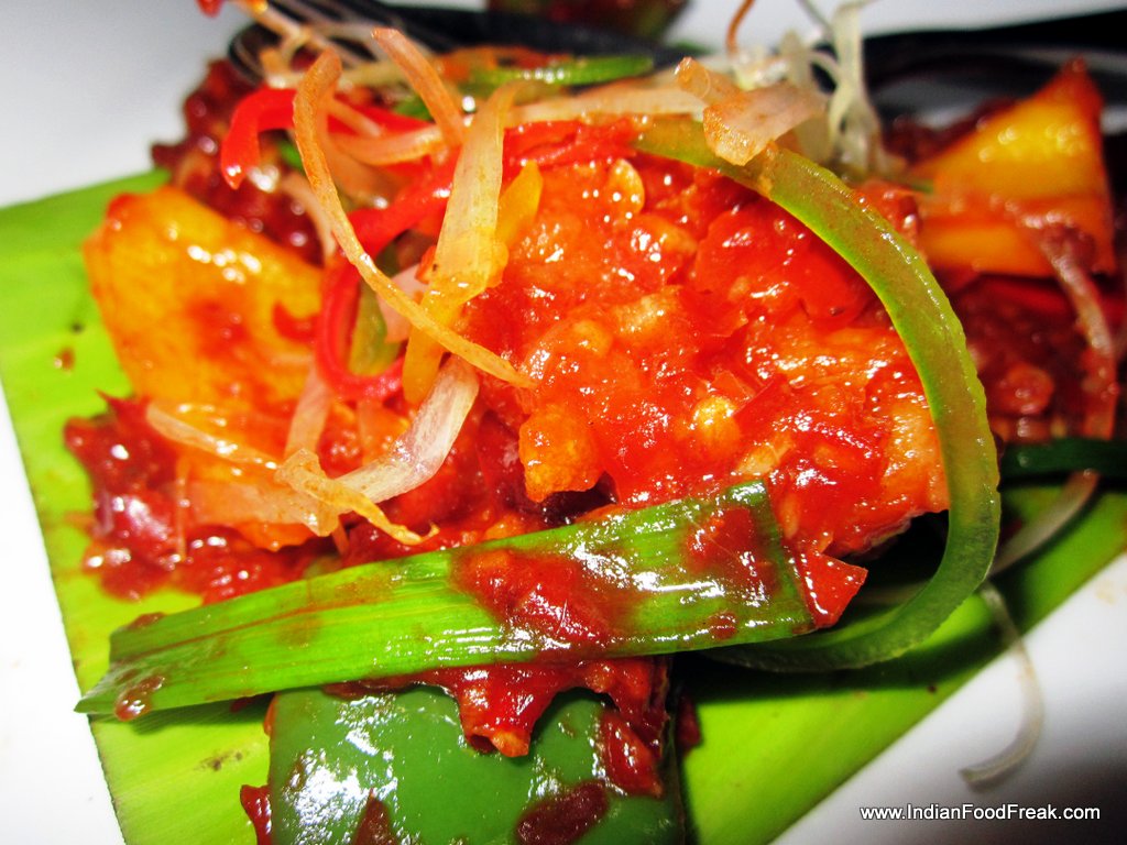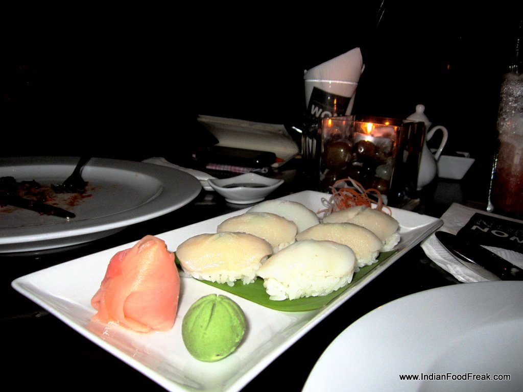 Scallop NigriAppetizers comprised Scallop Nigri where scallop was tapped on rice and served with pink ginger and wasabi. Next comes what I loved the most – Bird Chilly Prawns. It was spicy and simply yummy! Red chillies made appearances here and there, but this was the most delicious item I tasted at Nom Nom.