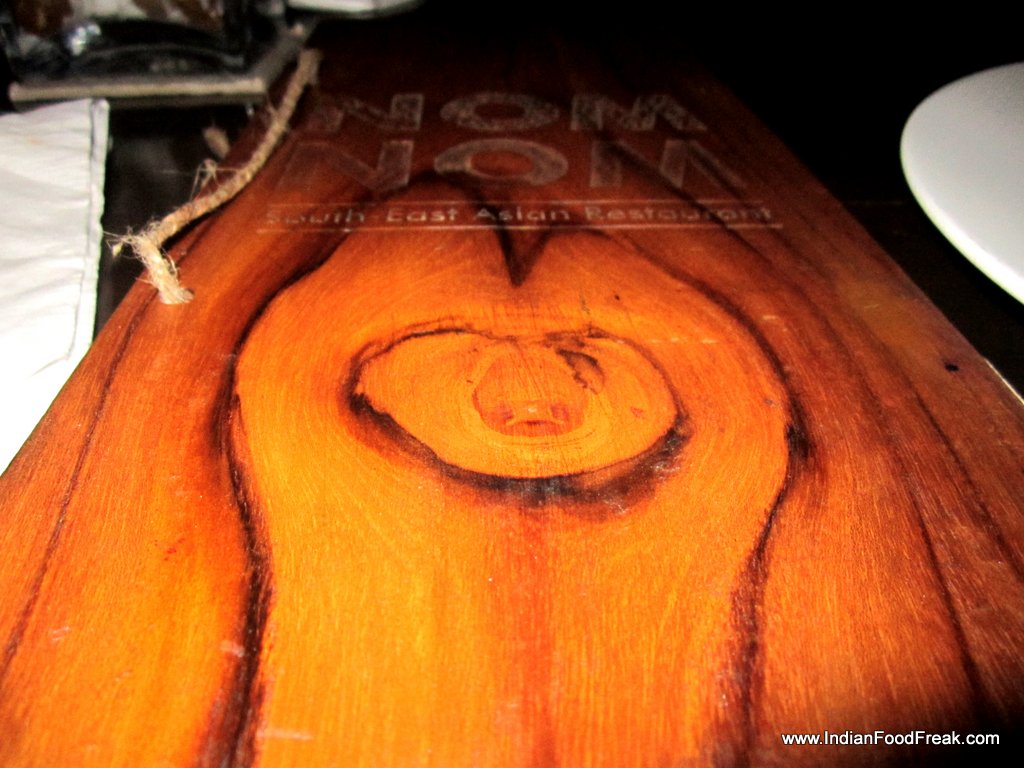MenuIt was creepy the way all the waiters were staring at us, but while leaving, the place was packed. Every single table was taken. Sadly, the one we chose was a bit wobbly. Anyway starting with drinks and food, we were given the menu. Nom Nom has tried its creativity with the menu and as per my friend, it looked like the tablets that were given to Moses by God with the Ten Commandments. It looked fancy, but was cumbersome and started annoying when I had to place repeated orders as the menu is stuck between two planks of wood. Suggestion: Limit wood to décor.