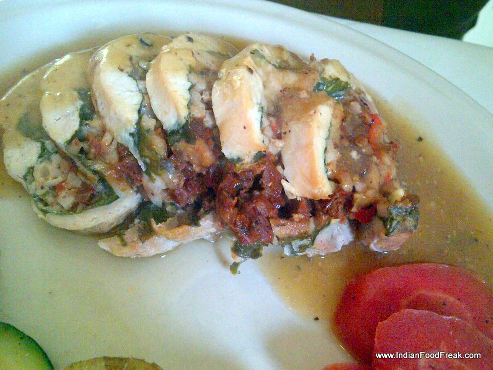 For the main course, I go for another favourite of mine, the lamb moussaka (Rs 535) while my friend wisely chooses the roast chicken (Rs 525). The lamb moussaka has layers of minced meat, zucchini and eggplant all topped with a great béchamel sauce, and then baked. The taste and texture are both befitting cordon bleu cooking, and every bite tastes different. The grilled chicken has been stuffed with sun dried tomatoes and black mushrooms and then beautifully plated. The chicken breast is grilled to perfection and is succulent soft. Fully satiated with the wonderful taste of the lunch still lingering in the mouth, we decide to skip the dessert.