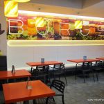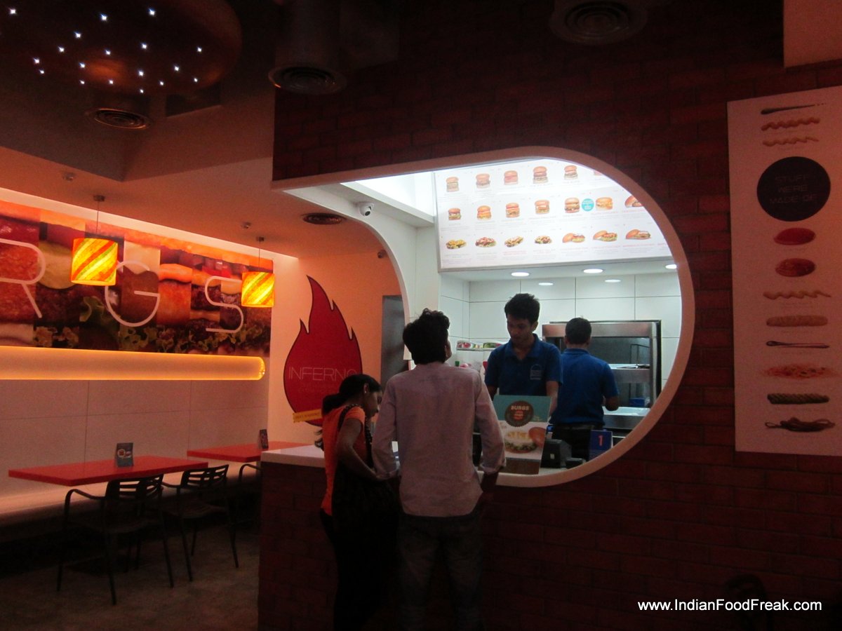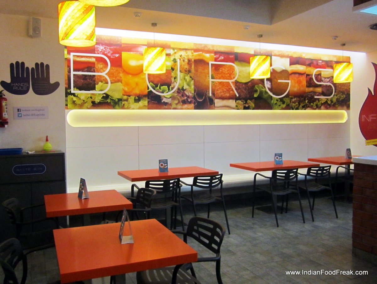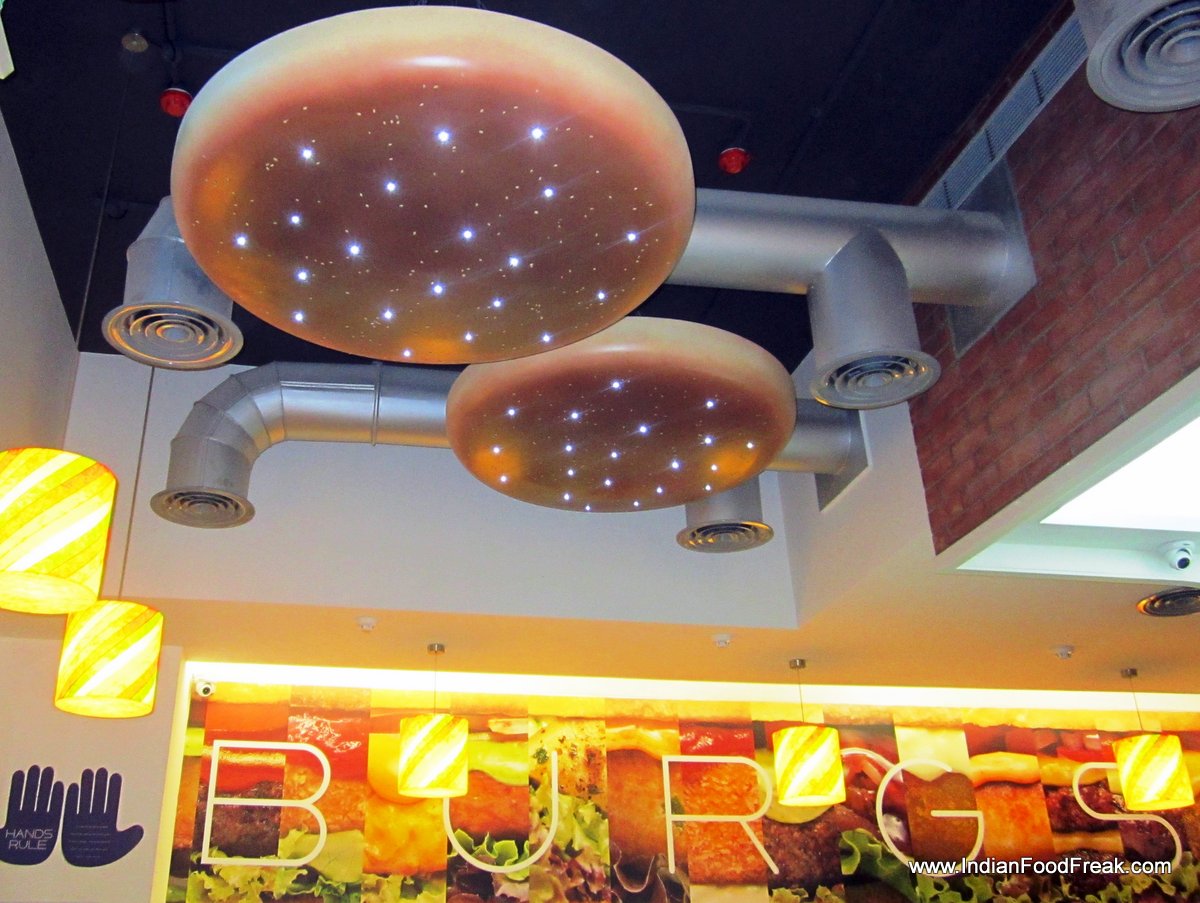 Burgs - Interior1The burger joint launched its newest outlet in Andheri (West) off Veera Desai road. The place looked charming with the bright and colourful décor. What caught my attention first were the huge non-edible burgers on the ceiling.