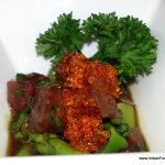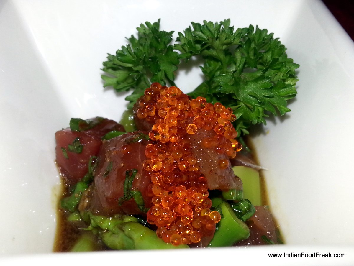 big-eyed tuna and asparagus topped with translucent orange flying fish roeThe amuse bouche (Not part of the menu) of big-eyed tuna and asparagus topped with translucent orange flying fish roe was a delightful surprise. The dish, a delight both to the eye and the tastebuds, boasted of buttery, creamy tuna punctuated by the crunchy, diced green asparagus and the glowing roe, all bathed in the mildly sweet wasabi laced teriyaki sauce.