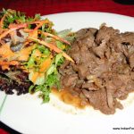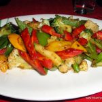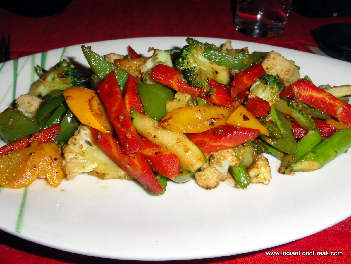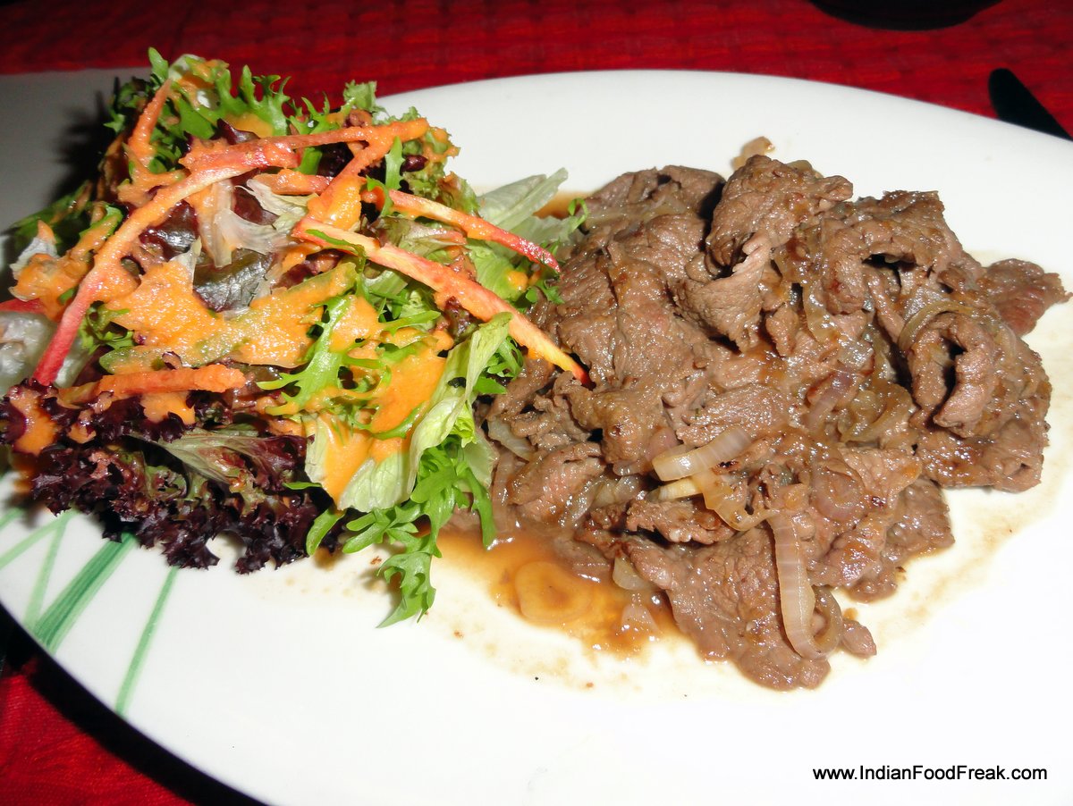 Yakinuku, thinly sliced tenderloinThe main courses that we opted for were put together with a balance of flavours, textures, and colours- The Yakinuku, thinly sliced tenderloin and the Itame teppanyaki, sautéed vegetables with soy and garlic. The yakinuku, a labour of love for Chef Ramon, the apple-onion sauce cooked on slow fire for three hours, exuded masterful interplay of sweetness of the apple and sting of the onion accentuating the perfectly cooked tender meat slivers. The accompanying fresh salad was drizzled with a light and tasty sauce made up of oil, vinegar, ginger, carrot and onion.