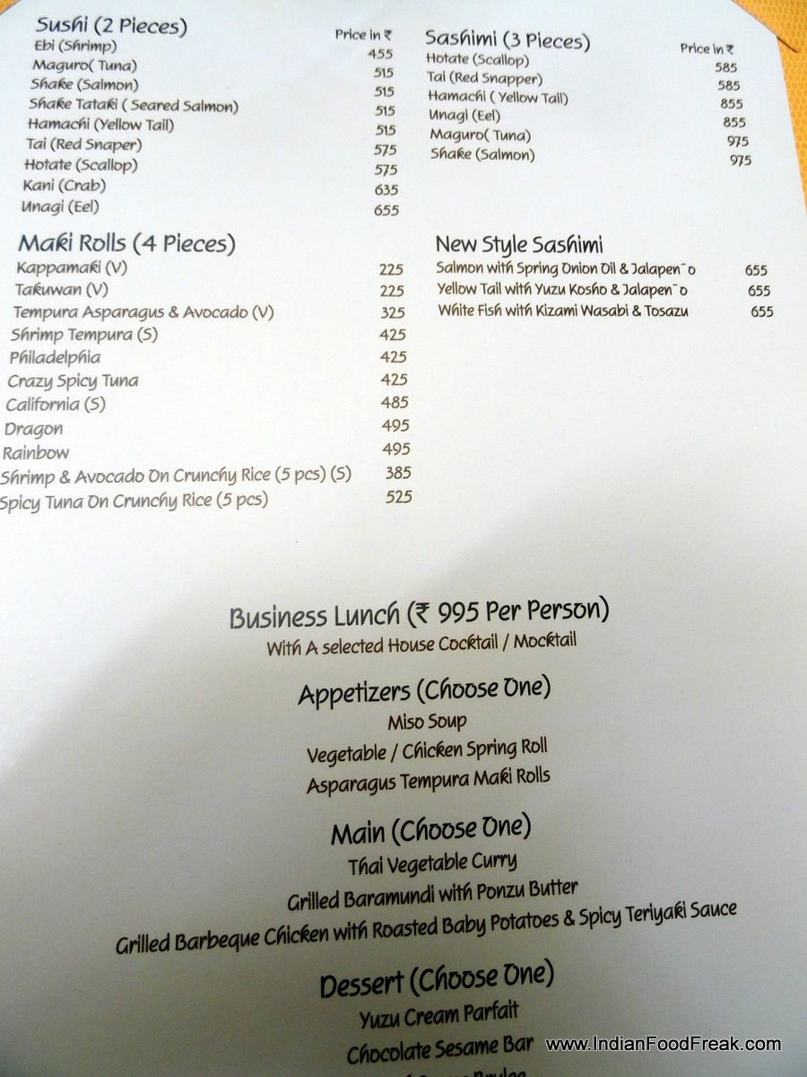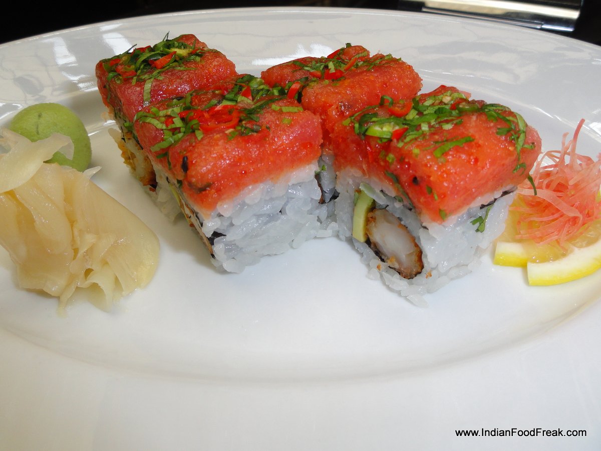 he Japanese starters are interesting. The new style yellowtail sashimi (Rs 655) is sliced yellowtail tuna but somewhat Sino-seasoned giving it a tangy and spicy flavour. The same thought process also carries on with crazy spicy tuna sushi (Rs 515) which has an interesting interplay of textures with crispy fried tuna rolled with rice in a sushi format. The white Marchesi Di Barolo wine that accompanies is crisp and refreshing, and adds to the taste of the dishes.