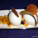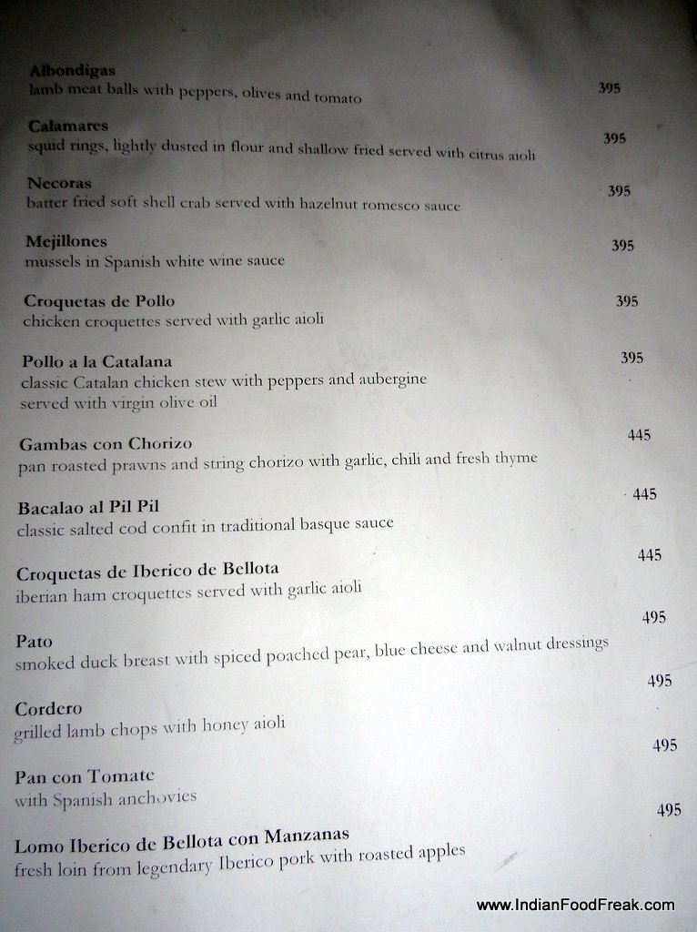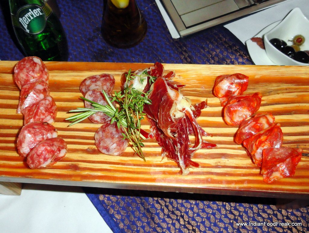 Sous Chef Nitin started us with the hot Leek soup a la Vichysoisse, a creamy, mildly pungent, tasty appetite whetter. The platter of Embutidos, consisting of slices of various Iberian sausages- spicy chorizo, chewy fuets, the peppery salchichon and the pride of Spain, the Spanish ham, was a perfect ensemble show. However, I found the spanish ham tad salty, which a true “pata negra” the best quality ham, should not be.