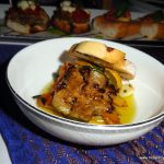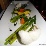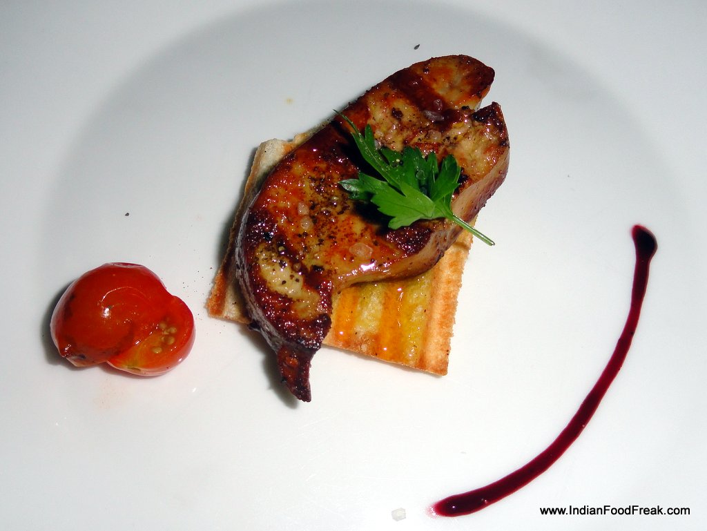 We were next set off on a culinary trail of mouth watering tapas specially crafted to bring out the best of the Josper oven. The Grilled Asparagus with romesco sauce, the pungent sweet vegetable pairing brilliantly with the red capsicum- hazelnut sauce. The Marinated Grilled vegetables– capsicum, zucchini, brinjal served cold with bread was a welcome intermission before the Goat cheese topped vegetables flavoured with fennel served hot on a piece of bread. Special mention must be made of the grilled Foie gras with red wine reduction served on crackers, sprinkled with sea salt and resting on onion confit. A buttery smooth grilled foie teased by the grainy salt and sweet confit was a true gastronomic delight.