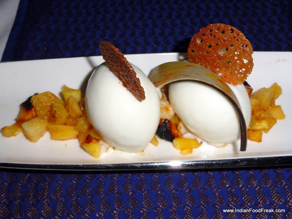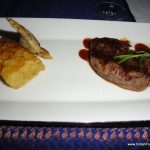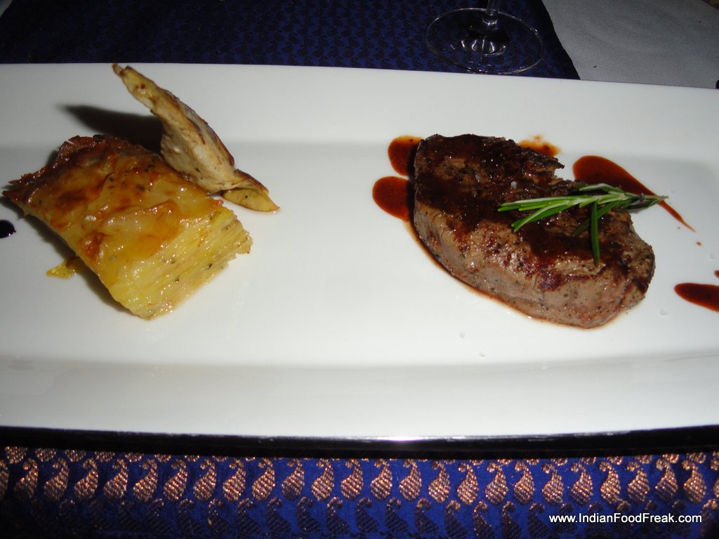 At this juncture, I was at a point of joyful satiation with the various tapas having taken on the form of a full blown meal. But I am glad I did not refuse the Grilled Chilean Sea bass that trooped in next. The fish came with crispy brown skin glazed with white buttery lemony sauce, the meat so soft, so flaky, so tender that I was afraid that it would slide past my throat into my innards before I could savour its simple but fabulous texture and taste. It was undoubtedly the crowning glory of the evening. The Angus tenderloin that followed was another masterpiece served with artichoke and an innovative potato lasagna that could qualify as a vegetarian main course by itself. The meat was done medium-rare to perfection and Chef Nitin informed us that the potato is left overnight in the Josper Oven to slow grill over charcoal fire and that lends it a flaky, crispy texture.