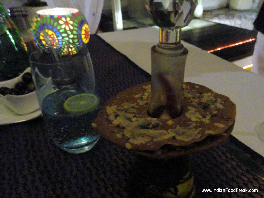 But first, we were seated and offered a very delicious, light and fruity sparkling wine, Waldo Prosecco which hinted at the good things to come. A thin, round, flat bread much like the Indian crunchy matri but with a hole in the middle was tasty with chilli flakes and parmesan adding the right zing. The bread whose dough is made of toasted cereals called Gofio is a staple of the Canary Islands of Spain.