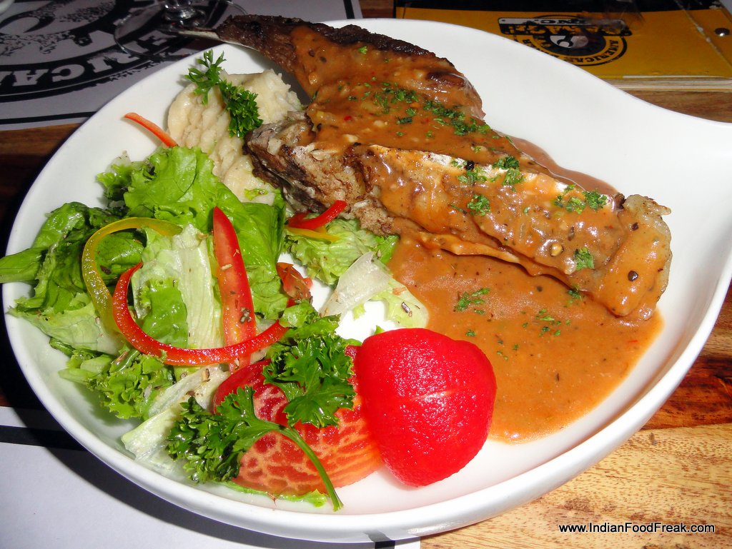This place was bringing out the carnivore in us and as our main course we went with pork chops and tenderloin burger. Pork chops (Rs 385) were cooked without asking for our preference and were a tad chewy since they were well-done. The tenderloin burger (Rs 335) was much nicer than most other places in NCR with moist and juicy patty. It could have been one of the finest if the bun hadn’t been so crumbly, patty not big enough to match the bun size and french fries crispier.