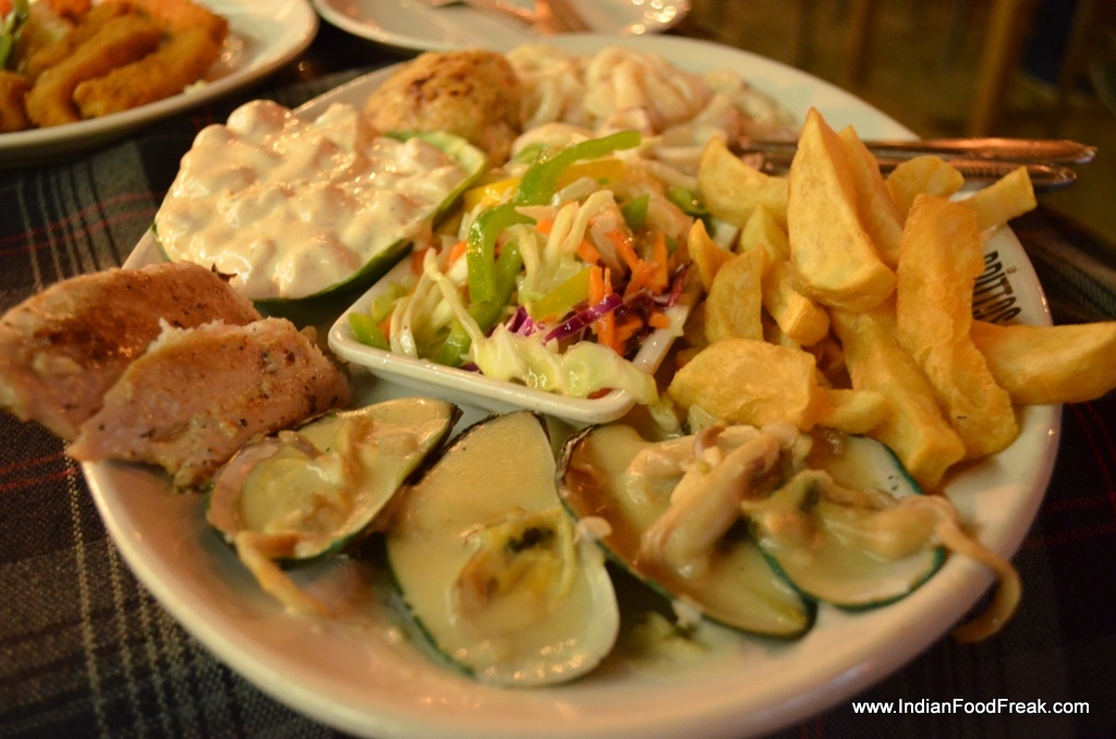But then, because of the food the day before, our loyalties had been established, so Britto’s it was, again. Lovely food again! We ordered a Seafood Platter (Mussels, Prawn Cocktail, Grilled Fish, Baked Crabmeat, Squids in a Cream Sauce)- out of the world! The mussels were velvet soft, yet retaining the bite, the crab had the required smoky flavor, the fish was perfectly cooked, the prawns with the right hint of sweet & sour and nice and creamy squids. Then were the Fish Fingers, beautifully crisp on the outside and soft & tender on the inside. Butter Chicken (!) was ordered, and surprisingly, it was great! Rich, smooth gravy with a hint of spice and sugar, went delightfully well with a butter naan. Heaven!