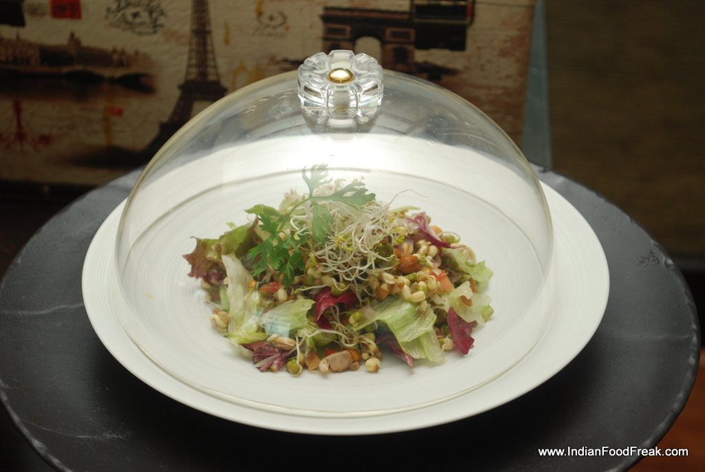 Sprout SaladThe Duck Salad that came in a Lilliputian jar looked interesting – though beware of the overpowering after taste of boiled duck. The sprout salad on other hand was a welcome change. Served on roasted papad for the crunch and contrasting taste, it could be one reason for calling a second run – with a change in dressing of course.