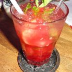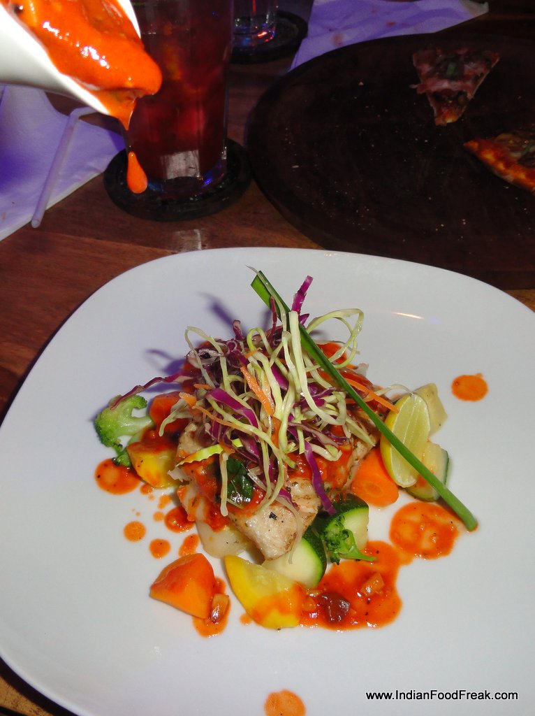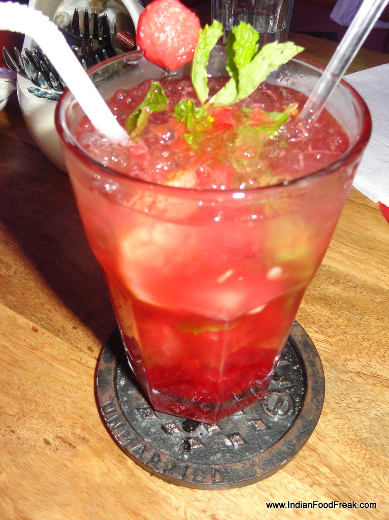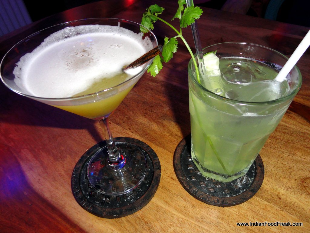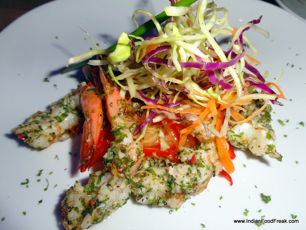 he cocktail that I decide to try is green apple martini (Rs 395) which is nice and tangy, but I realize that I would prefer my martini to be the regular shaken not stirred. Pawan has watermelon caprioska (a Brazilian liquor; Rs 395) that is refreshing. Chimichurri prawns (Rs 525) grilled with the Argentinian chimichurri sauce make a perfect, spicy bite, and the accompanying green papaya slaw compliments the dish well. The dishes till now have ranged from good to great, and we look forward to trying the main courses.