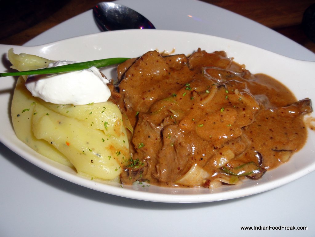 The first to arrive is actually the highlight of the meal – the vegetarian Amsterdam style Sicilian pizza (Rs 395), a thin-crust pizza topped with red chillies, mushrooms, cocktail onions, tomato sauce and mozzarella. The crust is perfectly baked and the combination of tastes and textures is simply superb. This is the best vegetarian pizza I have had in Delhi NCR. With our taste buds still tingling we go on and taste the next dish – shredded tenderloin sautéed with shiitake mushrooms (Rs 525). The first thing we discover is the excellent quality of the Amsterdam sourced beef that has been cooked to a melt-in-mouth taste. The meaty mushrooms and the accompanying brown sauce with cream and mustard compliment the dish perfectly. T