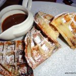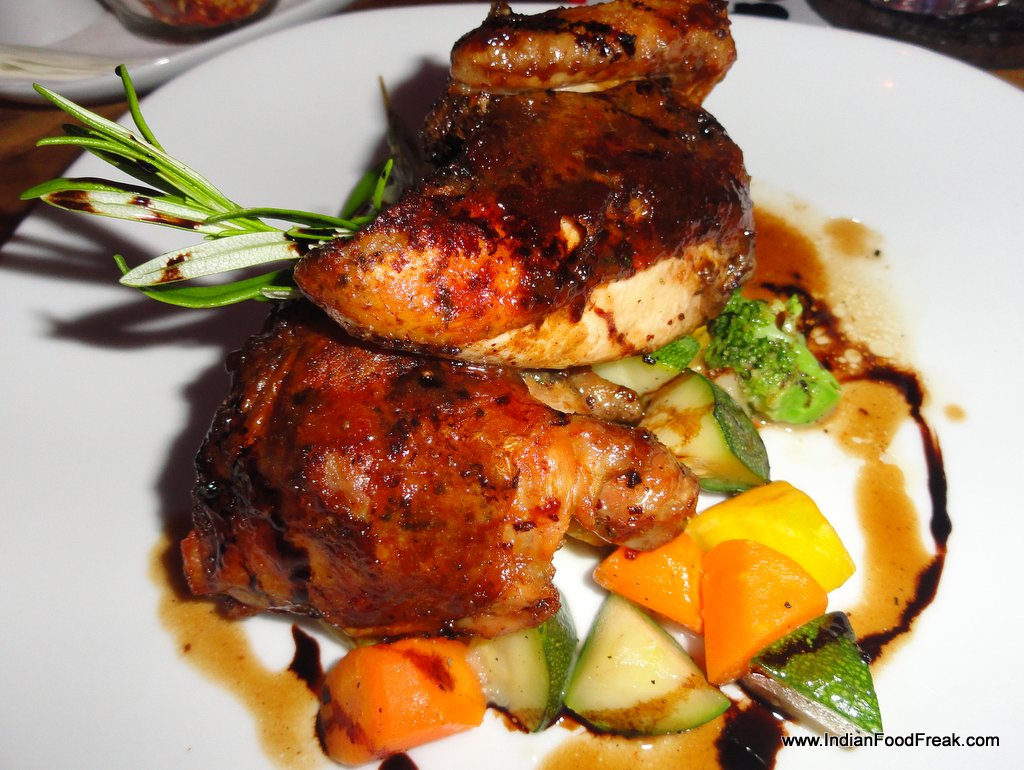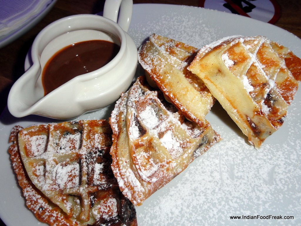 The next two dishes somewhat disappoint. The oven baked sole fish with a sauce of kalamata olives, pine nuts and cherry tomato (Rs 495) would have been perfect had the fish not been overcooked. The spit roast chicken with mashed potatoes and grilled vegetables (Rs 425) lacks a clear personality and tastes somewhat pointless. These are the only flaws in an otherwise wonderful meal that Chef Abhinav Sharma dishes out. We end the meal to the comforting notes of waffle with chocolate sauce (Rs 295).