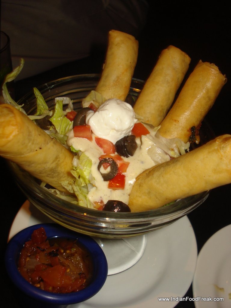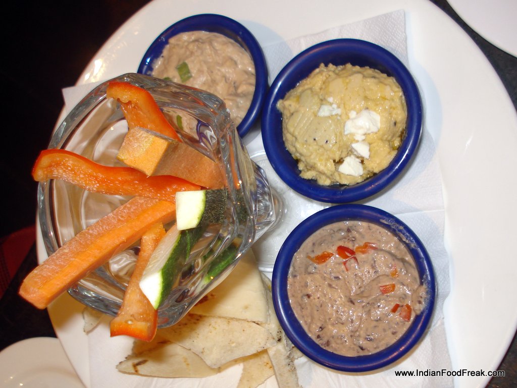 Between the vegetarian Hummus and Pitta bread platter and the Santa Fe Spring Rolls, the latter emerged a winner. Stuffed with spinach, black bean, corn, jalapeno and mixed cheese, these rolls were served on a guacamole and chipotle ranch dressing along with a salsa dip.