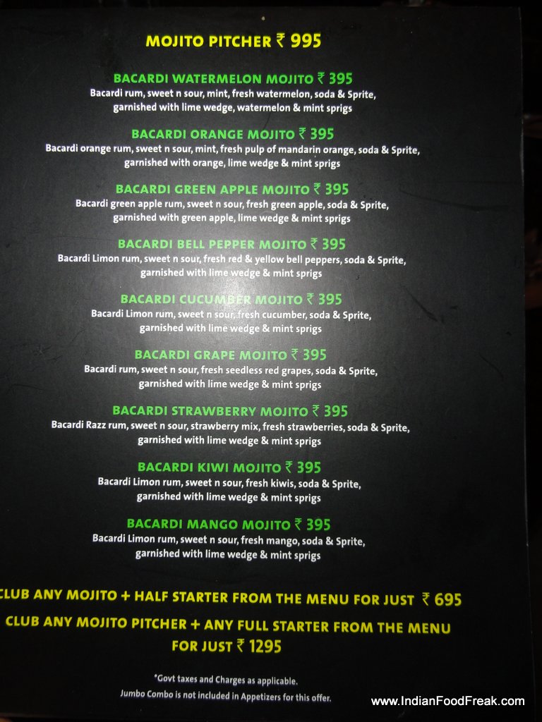 These mojitos are created in association with Bacardi, carefully using new flavored variants of Bacardi white rum. Available at an interesting price point, the ‘Mojito Mania’ offers patrons to choose any one of the nine mojito variants for Rs 350/-, you could add an appetizer (any from their regular menu) for Rs 300/- extra, or go for the mojito pitcher for Rs 850/-.