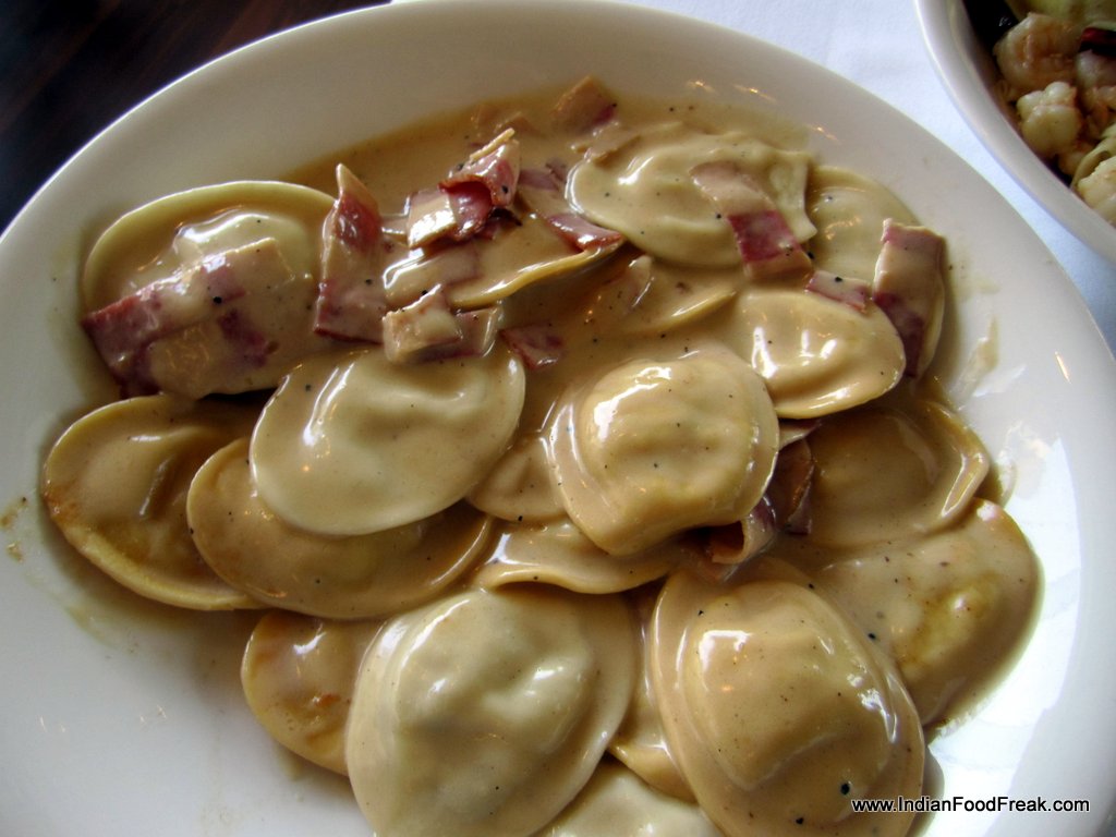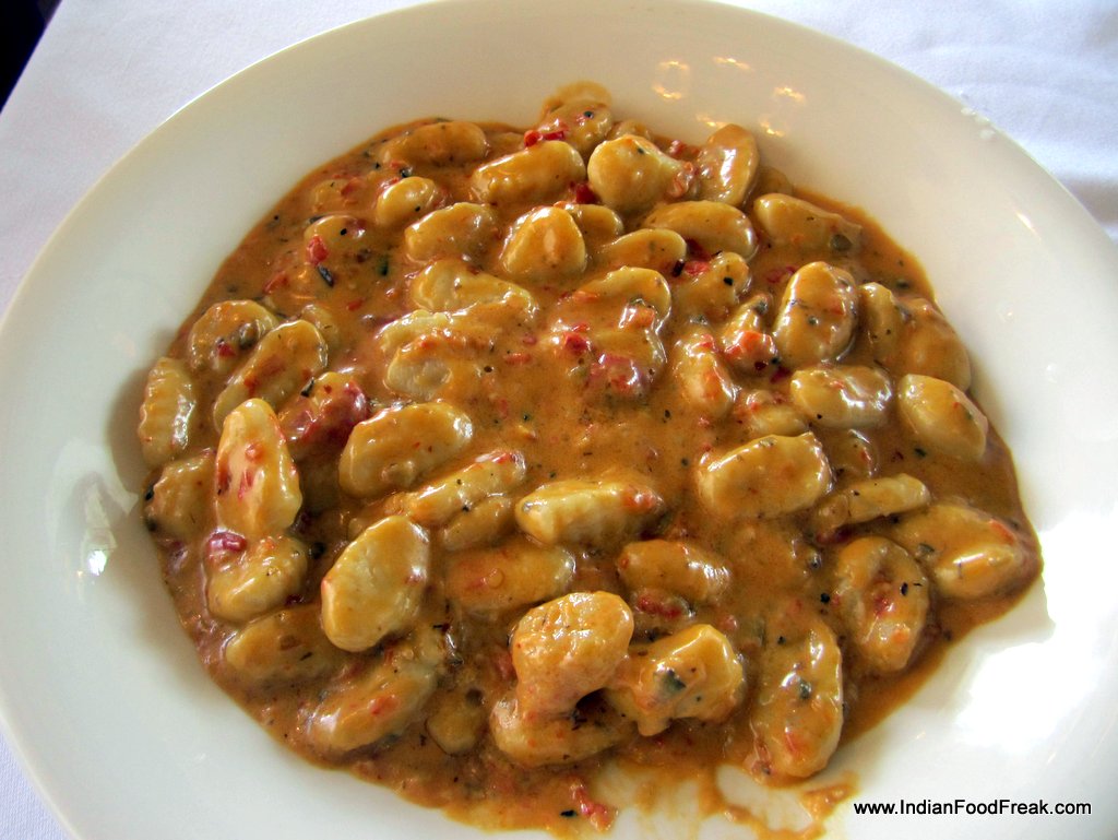 Gnocchi TremendaAs we are talking I am served fresh focaccia sticks (pane) with various toppings (Rs 225) to signal the start of tasting times. The rotondo in carbonara sauce with turkey bacon (Rs 750) which follows has pasta stuffed with ricotta, mushrooms and specs of black truffle in a creamy sauce. Nice dish, with the softness of the pasta getting accentuated by the smokiness of the truffle and the bacon. Papardele pepe nero with peperoncino e gamberi (Rs 750), a flat peppery pasta with prawns and a kind of aglio olio dressing, is light and pleasant. The most exciting one is the vegetarian gnocchi with a spicy tremenda sauce (Rs 550), a spicy, velvety, exciting combo. In fact this is easily the best gnocchi dish I have had in a long long time.