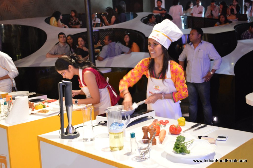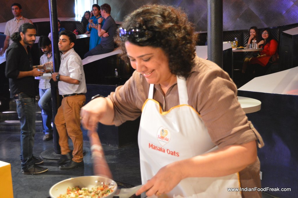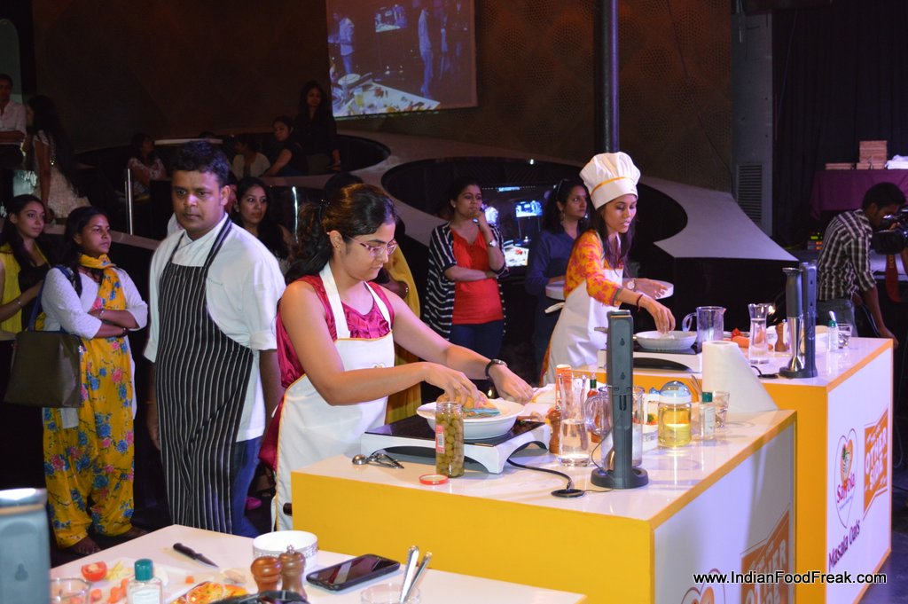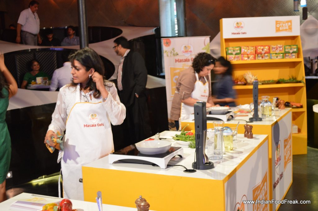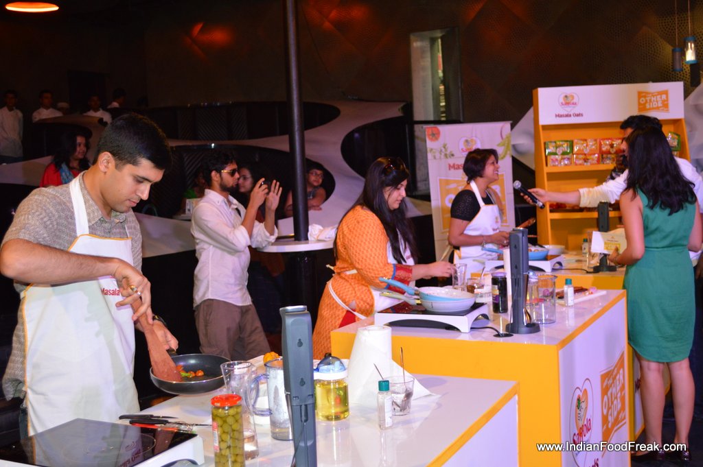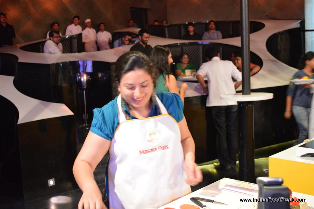 Second round was to make an interesting dish with Oats. Everyone knows oats is healthy but most eat at breakfast. Bloggers made Oats upma, Oats Pizza, Oats kofta among other dishes, which one can easily replace with vegetables during lunch & dinner. It was a wonderful sight to see the entire kitchen staff of Blue Frog out to see Chef Vikas Khanna speak and learn from him.