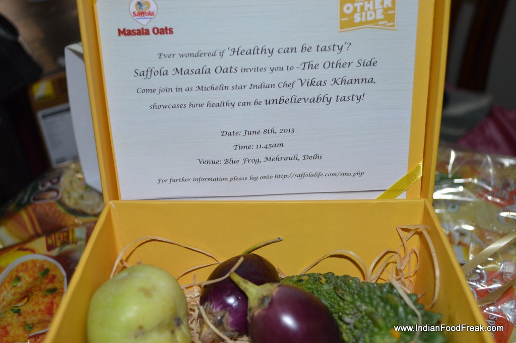 It is not usual to receive brinjal (Baingan), Apple Guard (Tinda) & Bitter guard (Karela) in a beautiful box along with an invite to a bloggers meet. Invite made a simple statement – “Healthy can be tasty” but with ingredients like these, I know how tough it could be. I did not think twice and accepted the Saffola Masala Oats invite which also said that Chef Vikas Khanna will showcase how healthy can be unbelievable tasty.