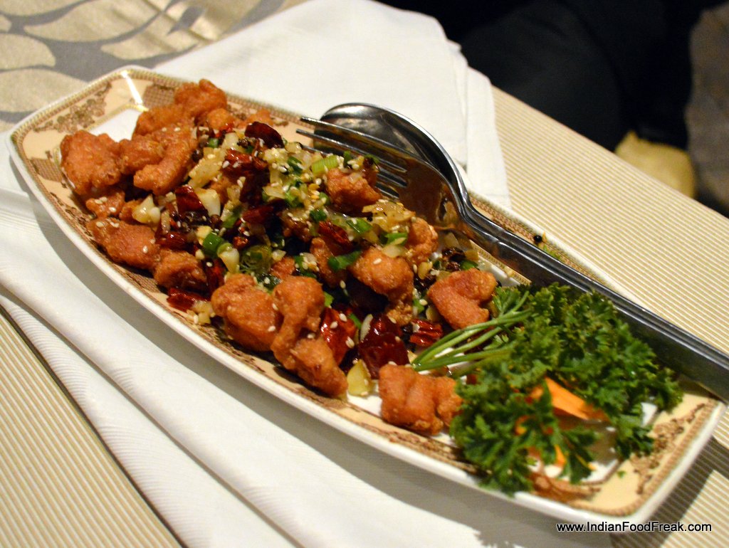 Few places in south Delhi can boast of a beautiful terrace lounge with mist effect, a personal dining room for large gathering (as well as for romantic duo), a remote controlled high ceiling that can open up to show the star lit night and of course an elegant interior with huge artificial plants. It was by accident that I discovered this beautiful restaurant, China Doll, specializing in Hunan cuisine.