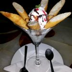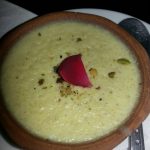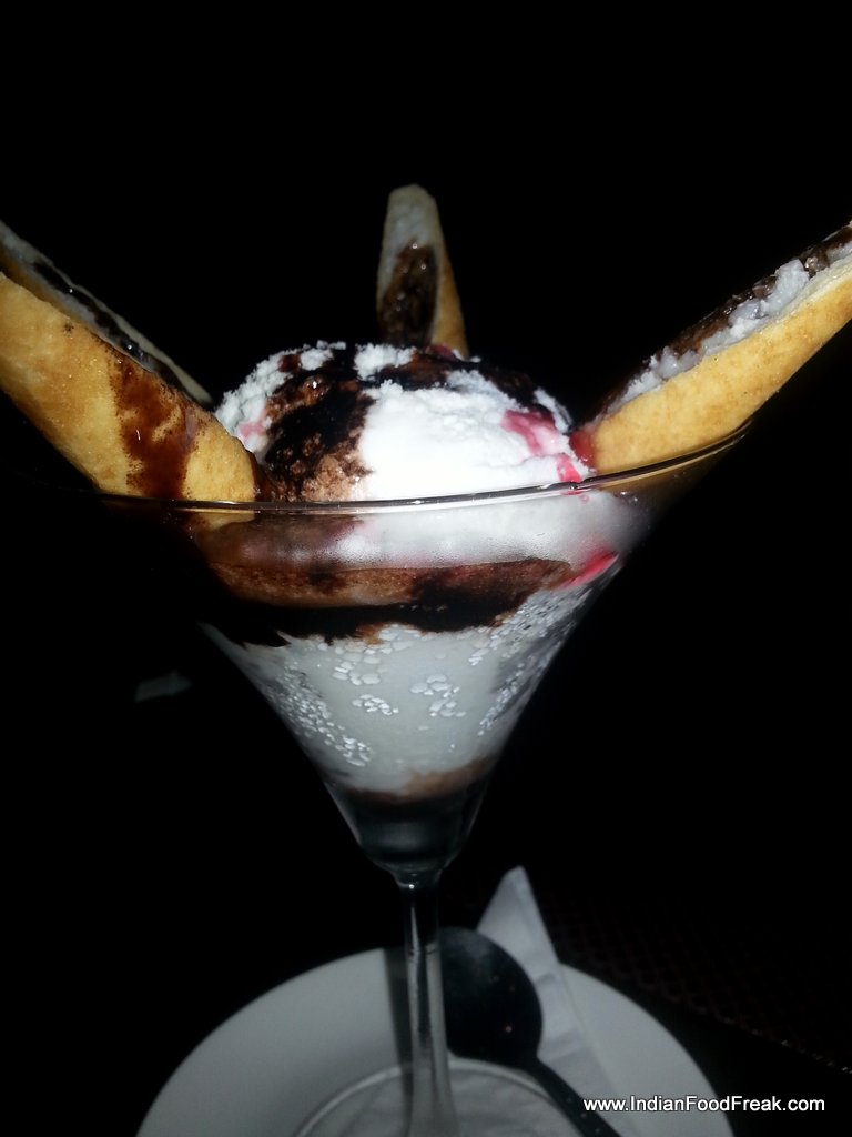 In desserts we requested for my all time favourite Phirni (Rs 155) and a dish with a unique name “Coconut Cigar with Ice Cream” (Rs 195). The phirni was outstanding but the coconut cigar with ice cream was a dampener. Helping of ice cream served in a goblet had four pieces of Cigars (Deep fried rice sheet filled with coconut and cut diagonally with a garnish of chocolate sauce). The cigars were chewy and the ice cream had ice granules that spoiled the creamy taste.