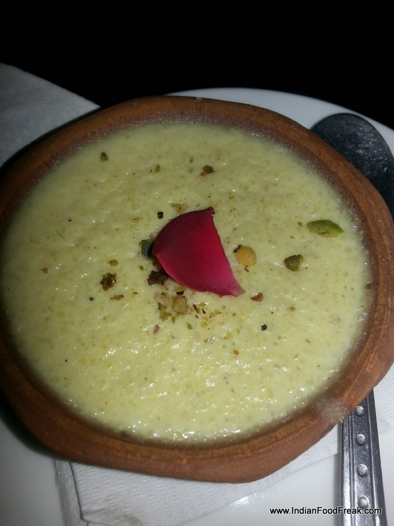 In desserts we requested for my all time favourite Phirni (Rs 155) and a dish with a unique name “Coconut Cigar with Ice Cream” (Rs 195). The phirni was outstanding but the coconut cigar with ice cream was a dampener. Helping of ice cream served in a goblet had four pieces of Cigars (Deep fried rice sheet filled with coconut and cut diagonally with a garnish of chocolate sauce). The cigars were chewy and the ice cream had ice granules that spoiled the creamy taste.