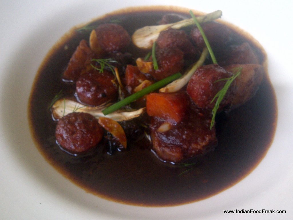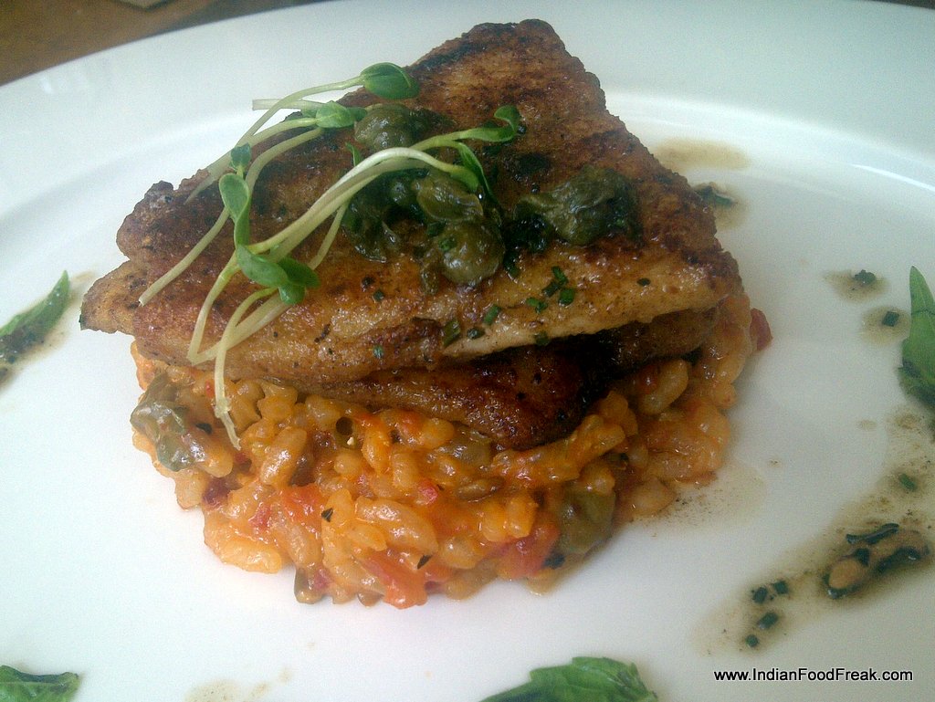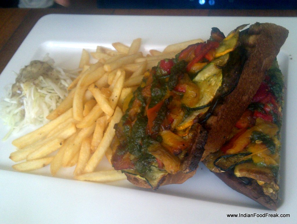 The first dish to arrive is grilled pork chop with caramelised onions, cumin jam and jus (Rs 690) which is competent though I am not too fond of the toppings which make the dish too sweet for my taste. Once I remove them, it tastes just fine. The pan seared John Dory with sundried tomatoes and sunflower seed risotto (Rs 700) is a great dish. The fish is cooked just right, and the pesto which it is served on complements the fish well. The open grilled vegetable and pesto sandwich (Rs 320) is boring and lacks character. The Spanish chorizo stew with potatoes and spring onions (Rs 720) is so over salted that it has to be sent back.