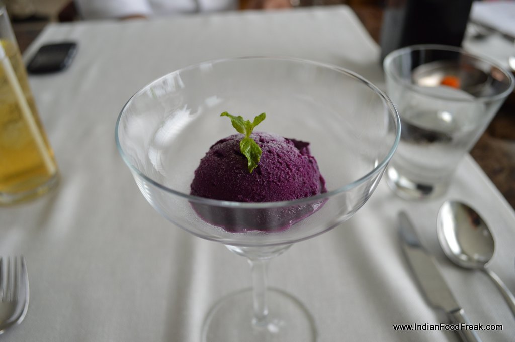 We start the tasting process with an amazing palate cleanser – fresh jamun sorbet seasoned with black salt. A bite takes me back to a taste redolent with memories of my childhood. Savouring the sorbet, I ask Anurudh what he sees as the soul of his restaurant. “We are the first to use authentic recipes, and forbidden fruits, vegetables with a unique presentation, and light, playful textures. Take the jamun sorbet for example or the bael sorbet that we also serve”, he continues, “these need serious efforts going into local sourcing and foraging. It is this foraged produce that contributes to making Fire unique.”