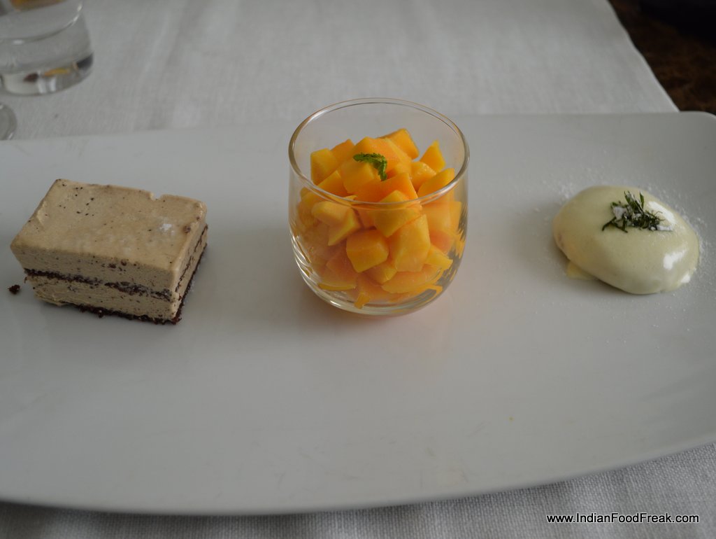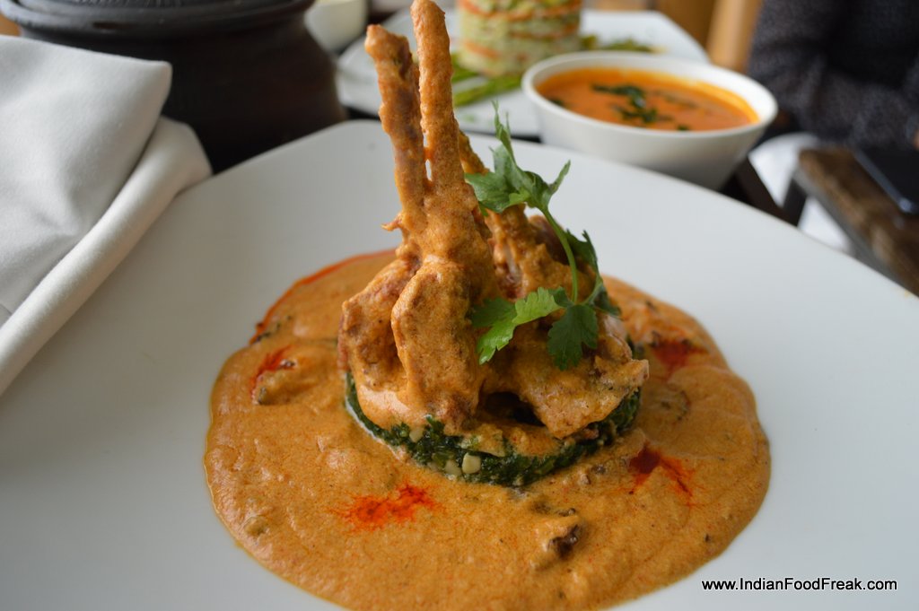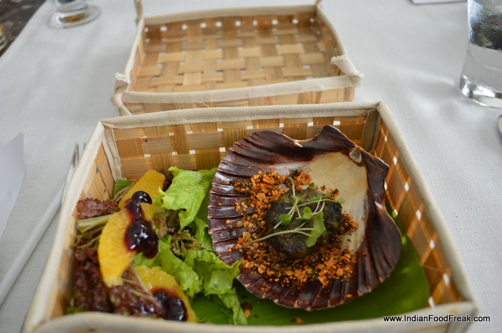 The curry leaf scallops with poppadom dust and mustard cress (Rs 895) is an inspired idea but alas not backed by an equally inspired execution. The dish is over salted and not optimally cooked, with the inside of the scallops being mushy rather than spongy.
