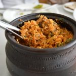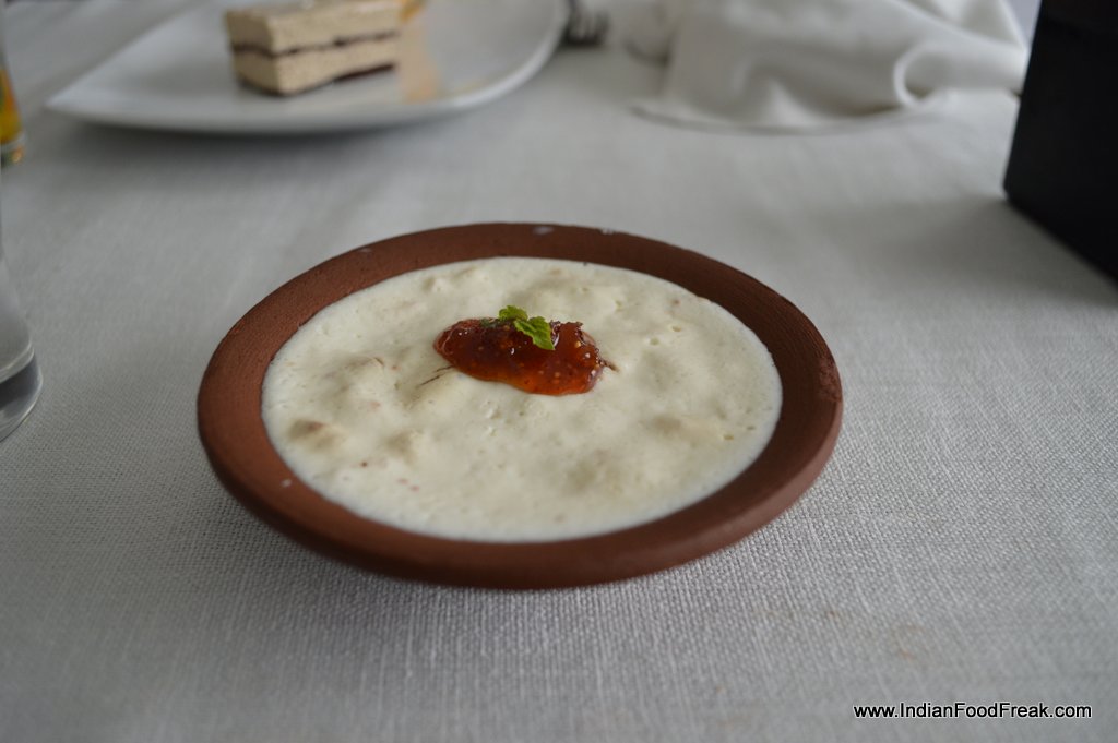 Breaking the linearity of a traditional meal, what we are served next is an ice-cream. Tender coconut pearls (Rs 425) is a tender coconut ice-cream served inside a halved coconut shell. It is very much like what Natural’s in Mumbai serves, though the dish can be improved by adding only the tenderest of tender coconut flesh to the base.