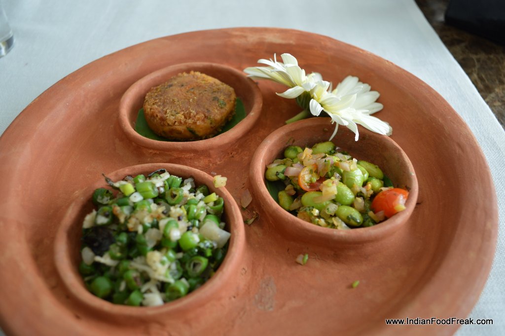 Kurkure karele ki chatThe first dish to arrive on our table is a vegetable that is normally forbidden in restaurants. Kurkure karele ki chat with fresh pomegranate seeds (Rs 425) is crisp, sweet, spicy, tangy, bitter and rather addictive. The platter of trio of beans (Rs 425) has authentic tasting green beans poriyal, a very clever edamame masala, and soft rajma shami kabab, with each of the components being an enjoyable experience.