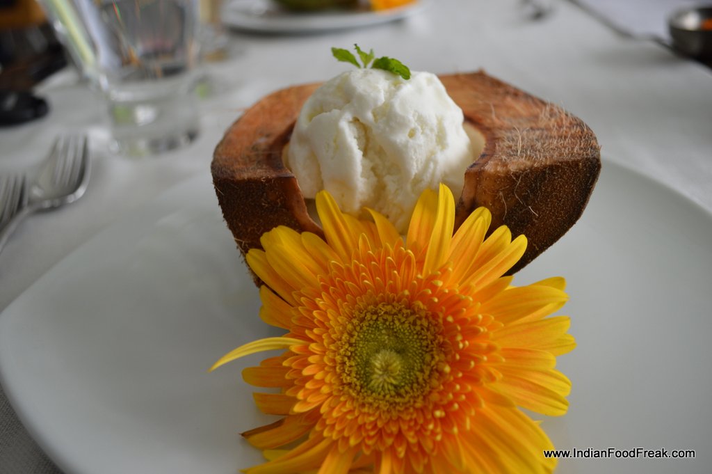 Tender coconut pearlsBreaking the linearity of a traditional meal, what we are served next is an ice-cream. Tender coconut pearls (Rs 425) is a tender coconut ice-cream served inside a halved coconut shell. It is very much like what Natural’s in Mumbai serves, though the dish can be improved by adding only the tenderest of tender coconut flesh to the base.