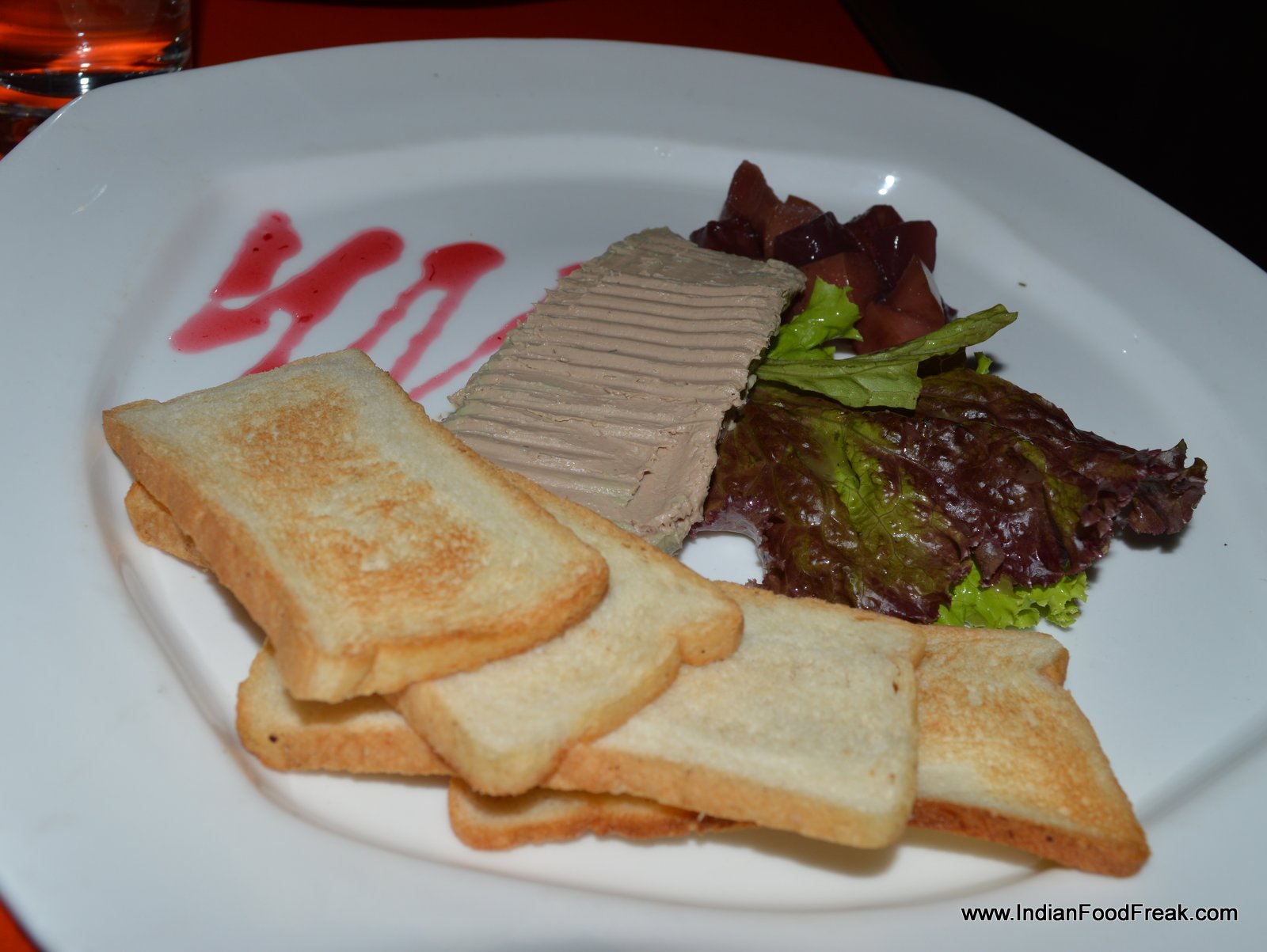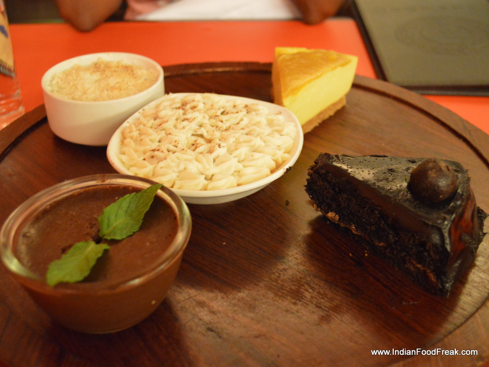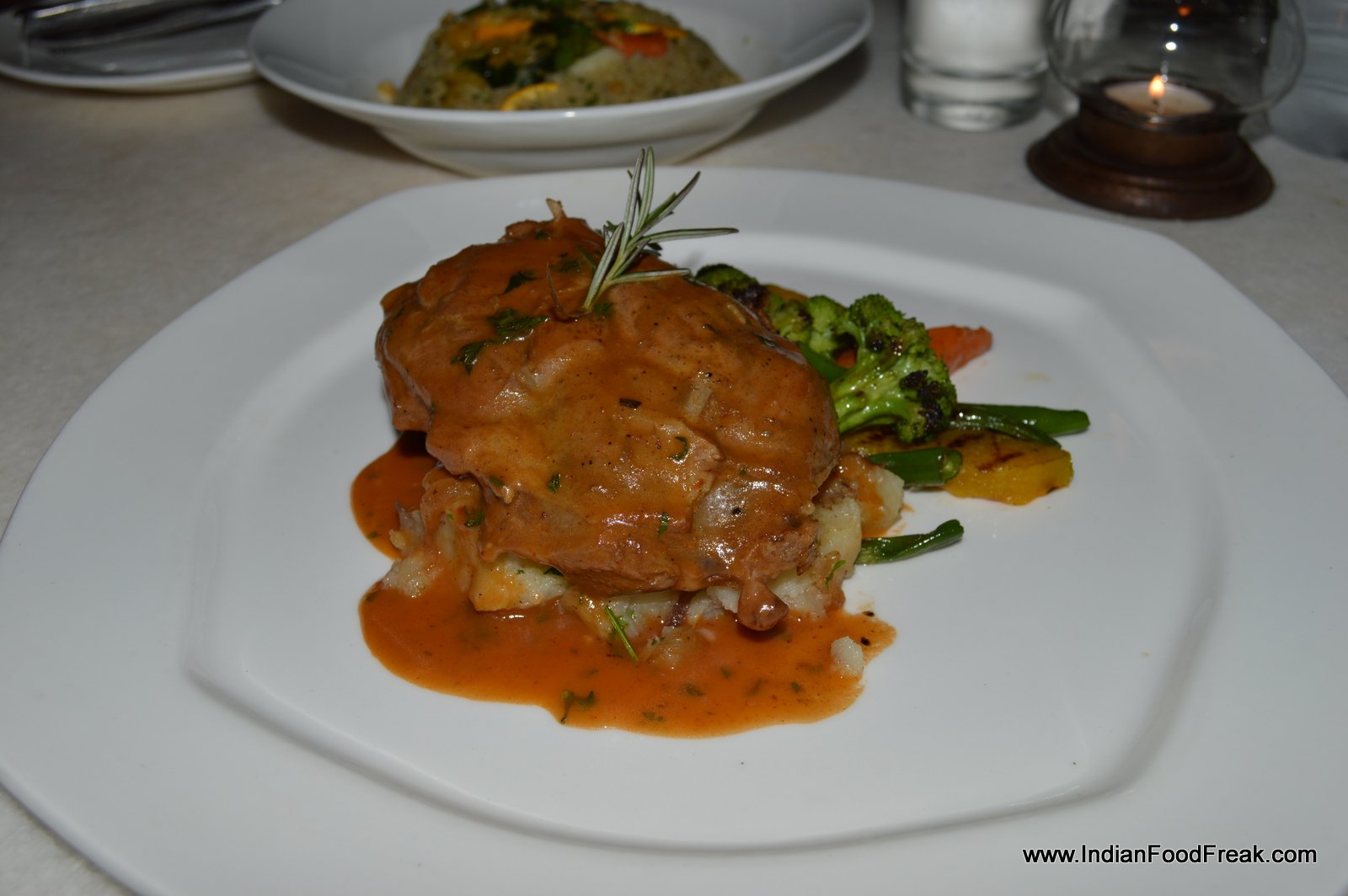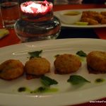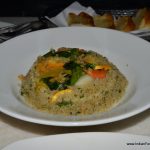 Then it was the food’s turn to continue with the nebulousness, with some dishes blowing hot and some blowing cold, literally and figuratively. The cold Mango Yoghurt Mousse was an excellent way to start the meal, the perfectly blended sweet-sour concoction given a tangy twist by Indian chatpatta masala. I enjoyed it till the very last drop. Lodhi Chicken Liver Pate offset with caramelized cinnamon flavoured fruits was a hit with Pawan. Panco Fried Chicken was ordinary but served hot and crispy with a dilute honey mustard sauce. I would have preferred it heavier on mustard in place of honey, as it was too sweet and watery. Risotto Dumpling- fried risotto stuffed with cheese and pepperoncini while indifferent tasting, could have been better, served with more of the underlying tomato-based sauce. It was too dry.
