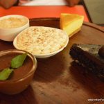 The desserts were displayed old school, on a tray brought to the table and one had to pick one’s choice which was then brought forth from inside. The Banoffee (banana-toffee) tart and the Mango Cheesecake were both served with crumbled biscuit base which was déclassé, in comparison to the classy trout and lamb. It took away from the otherwise passable dessert selection. The Cold Fume– fresh ginger, basil and lemon rind muddled vodka drink is a simple but satisfying cocktail while the Cosmopolitan stayed true to its name.