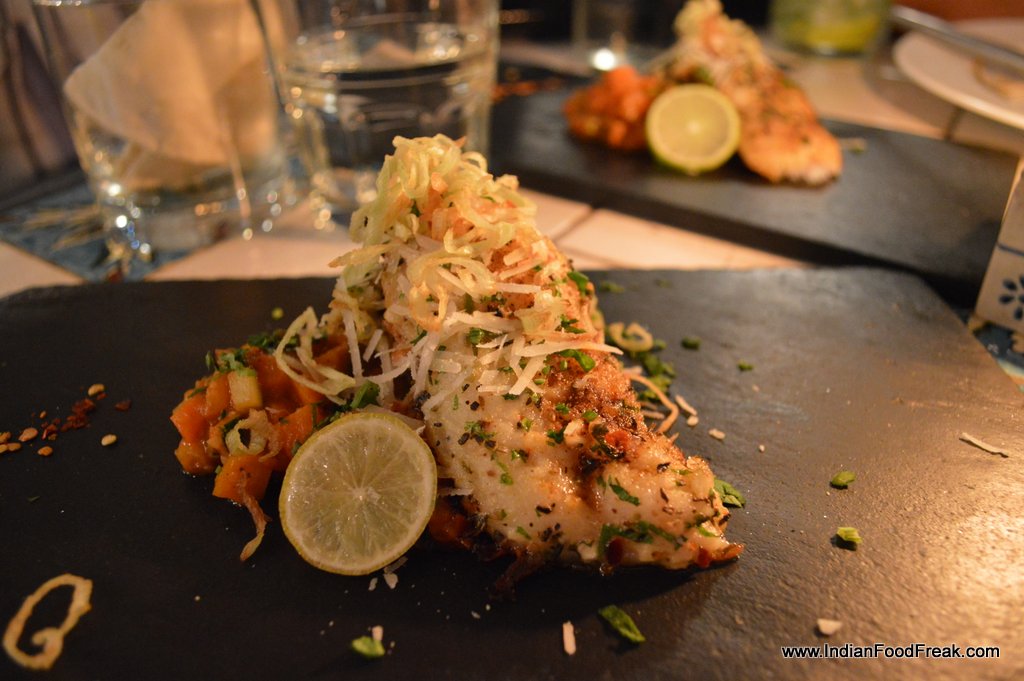 The first dish to arrive was wood fired charmoula chicken (275) served with hummus sprinkled with zattar. The succulent chunks were indeed very nice however I missed the smoky flavor that should have come from the wood fired oven. The lamb kebabs (325) done in Moraccan spices and served along with Tahini dip were mouthwatering. Every bite into the morsel prepared us for the next bite. Chimichurri rubbed Basa (375) was a bit over salted given the salt content in chimichurri. It was cooked well to retain its moisture and the accompanying mashed potatoes with flavors of Jalapeno and olives were even better.