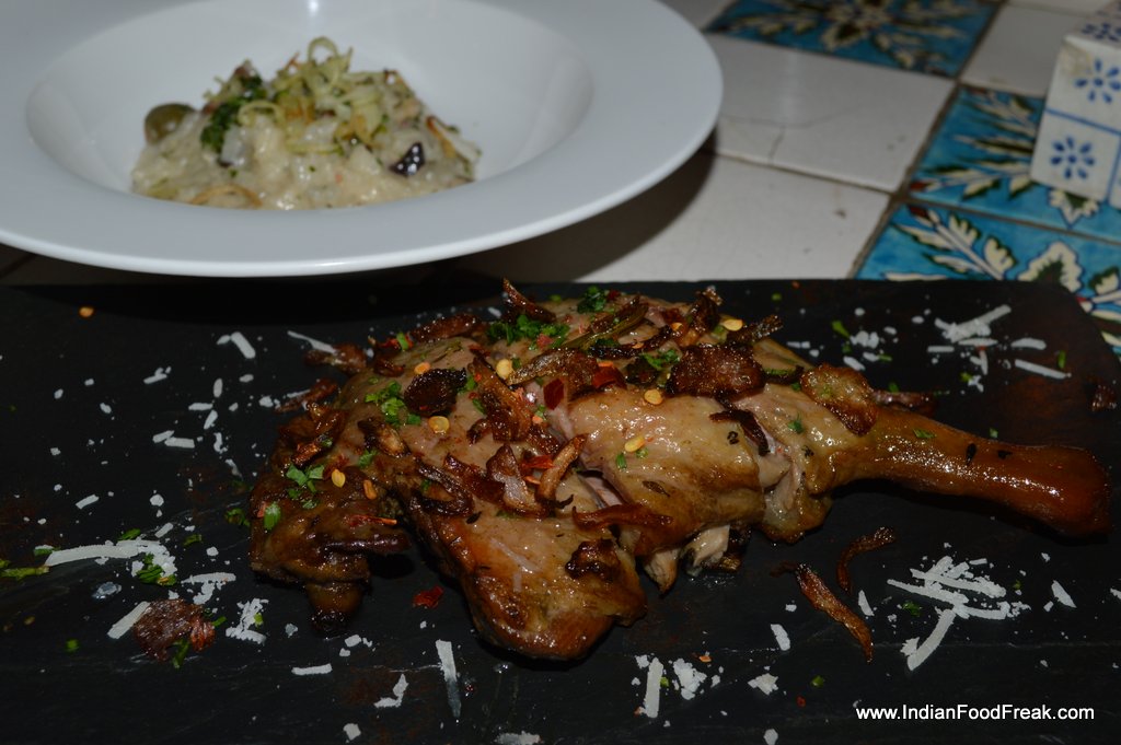 The Pepperoni pizza was another ace from the clay oven. The edges were crisp but not burnt and the base was right. Few more pieces of pepperoni and it would have hit just the chord that an excellent pizza touches. The best was still to come, risotto served with duck leg confit. The risotto was creamy without addition of cream; a sign of a mature chef. Duck leg confit was undoubtedly the best with crisp skin and very tender and juicy meat inside. Wish the risotto was a bit al-dente.