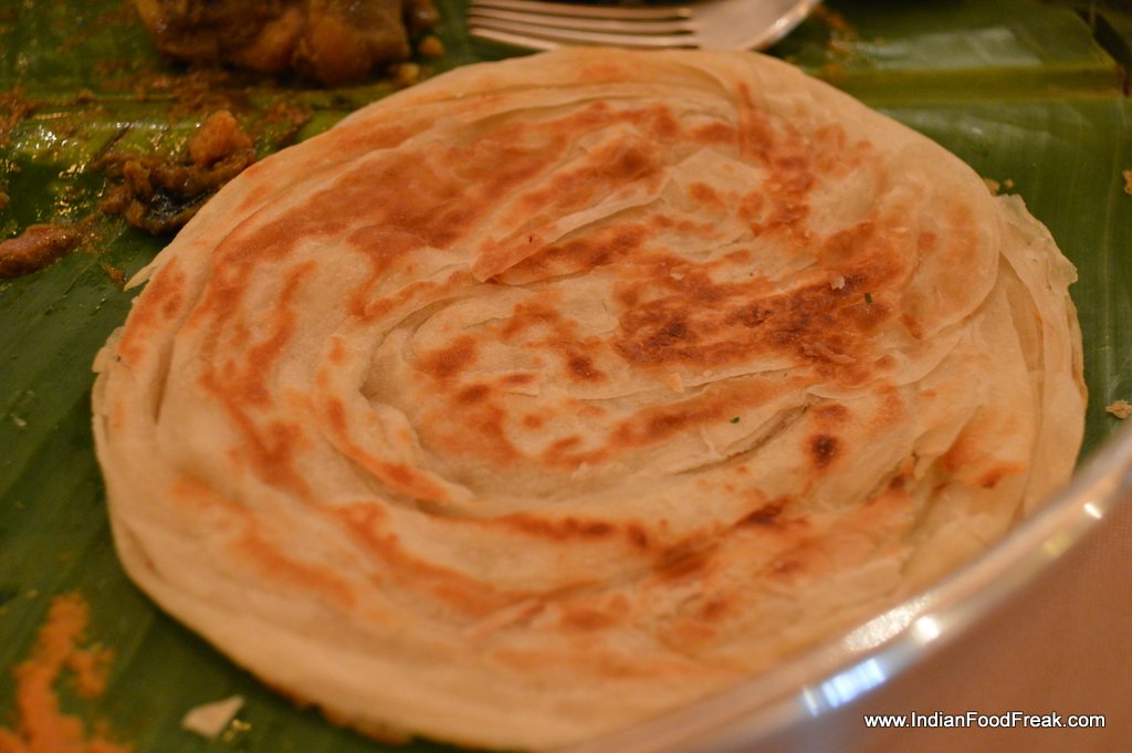 veechu parottaAfter a brief wait where I sample some pickles from their vast selection, the mains start arriving. Ghongura mamasam (Rs 1100) from coastal Andhra is nice, except that it is not fiery at all, unlike most dishes from coastal Andhra. Raal poruma kolli (Rs 1300) is a prawn dish from the Mudaliar community. It is cooked with vadakam, a mixture of onions, garlic and some spices, and fresh drumstick leaves. It is a fine tasting ‘peasant’ dish; truly what I have come to expect from Dakshin. Another dish that delights is pachakari varattiyathe (Rs 700), a hot and tangy Moplah vegetarian curry. The accompanying appam (Rs 175) and veechu parotta (Rs 250) are impeccable.