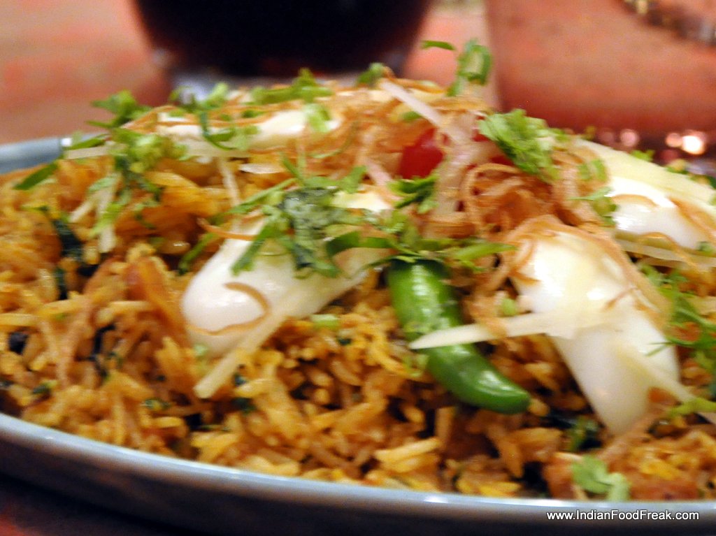 KOZHI KODAN BIRYANI– Kerala style chicken biryani reminds one aptly of the spice capital of India, redolent with aroma and spices, the boiled egg wedges perfecting the dish.