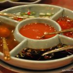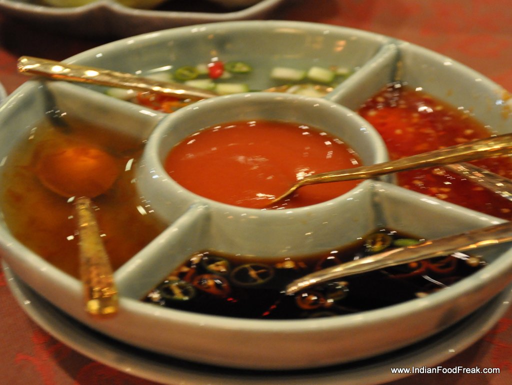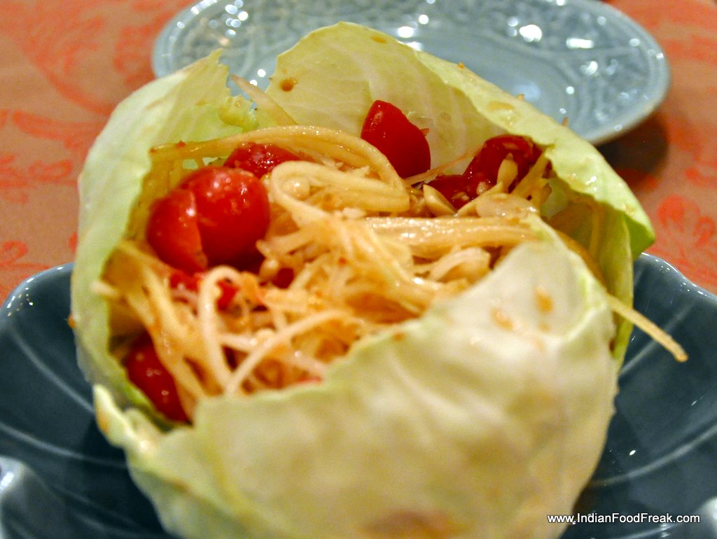 The meal was rounded off with THUB THIM KRUB– colourful Thai water chestnuts served in sweetened coconut milk and crushed ice. The chestnuts were smaller than the one available in India and were dyed red with grenadine syrup and green with khus. It was a cool closure to an appetizing and spicy meal except that personally, I would have liked it a little less sweet.