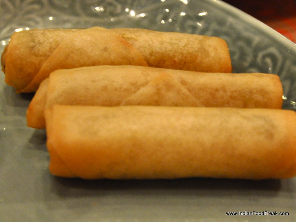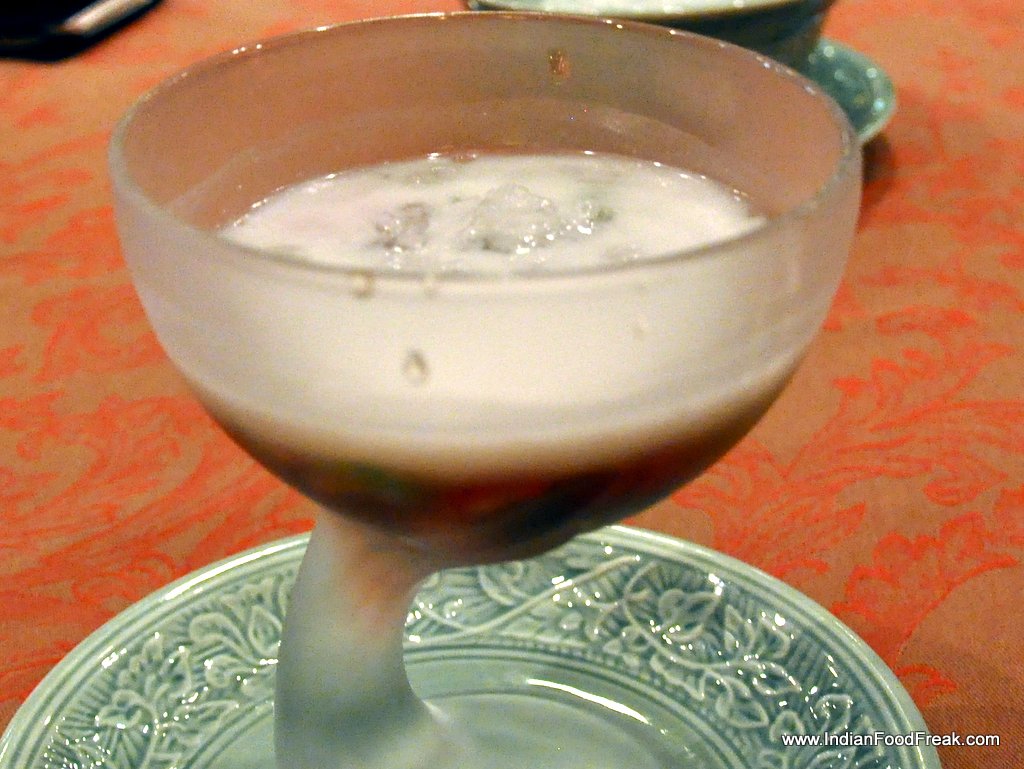 The meal was rounded off with THUB THIM KRUB– colourful Thai water chestnuts served in sweetened coconut milk and crushed ice. The chestnuts were smaller than the one available in India and were dyed red with grenadine syrup and green with khus. It was a cool closure to an appetizing and spicy meal except that personally, I would have liked it a little less sweet.