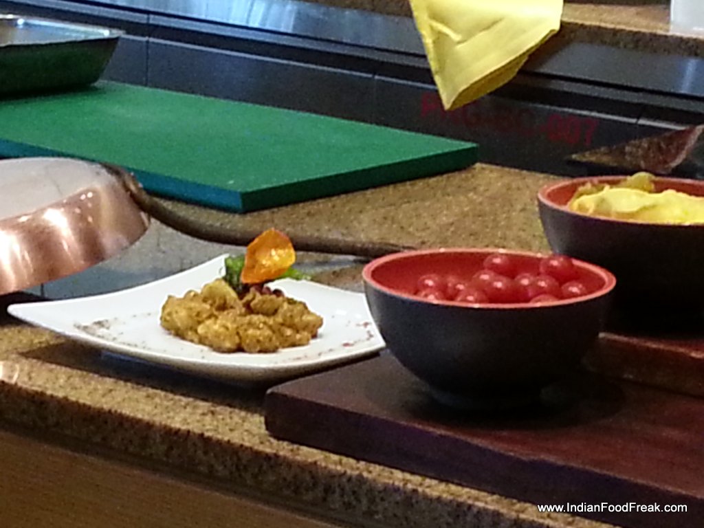 The simple Prawn rolled in sliced and fried Zucchini and doused with freshly prepared, spicy arrabiata sauce kickstarted the palate with its biting heat quotient rendered by liberal use of chillies. The prawn was done perfect, succulent and contrasted ably with the crunchy Zucchini wrap and the spicy sauce.