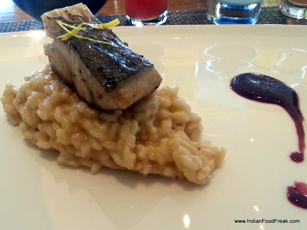 The Chef’s next offering, not on the day’s menu, was simply out of the world. Lime Risotto with sea bass was exquisite. The simple flavours of the plain al dente risotto were enhanced by the mild, citrusy tang of the lime, playing hide and seek with the palate. The sea bass sitting pretty atop it was the crowning glory, un-adorned, un-embellished, seafood in its purest form. I hope and wish, this dish shall find its way to the upcoming new menu.