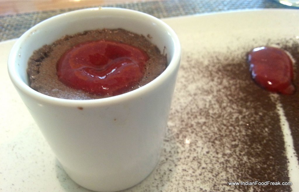 Now to the resounding piece de resistance of the day, never mind that it was a simple dessert. The ridiculously simple one going by the diabolical name of Tortinomorbido al Cioccolato con salsa alleFragole was a masterpiece. As you dig into the crunchy baked crust of the chocolate mousse, it gives way to the hot, viscous, lava like hot chocolate within, counterpointed with the lip-smackingly tangy strawberry coulis. It was bottom scrapping delicious.
