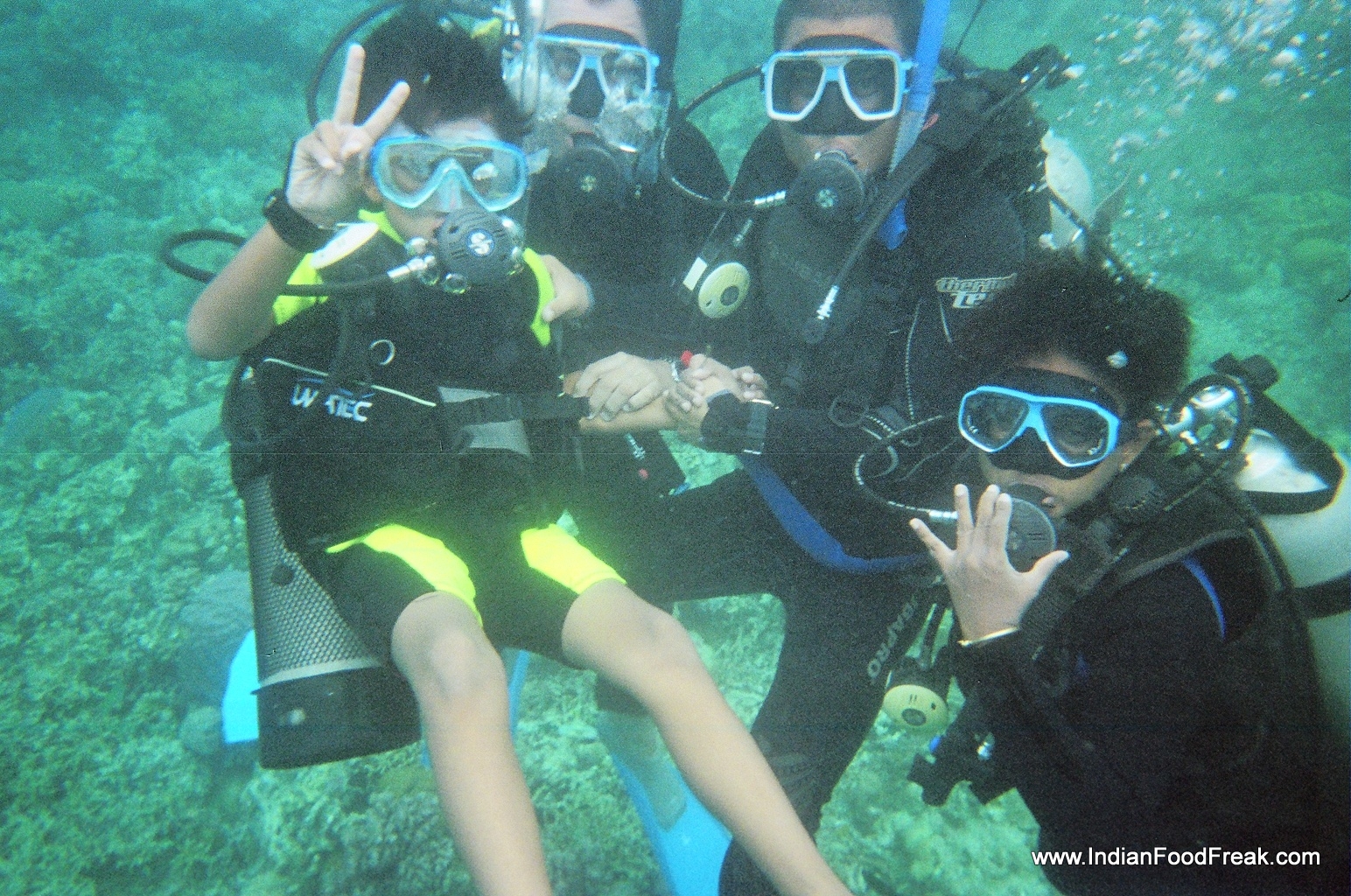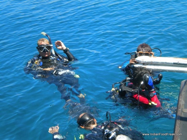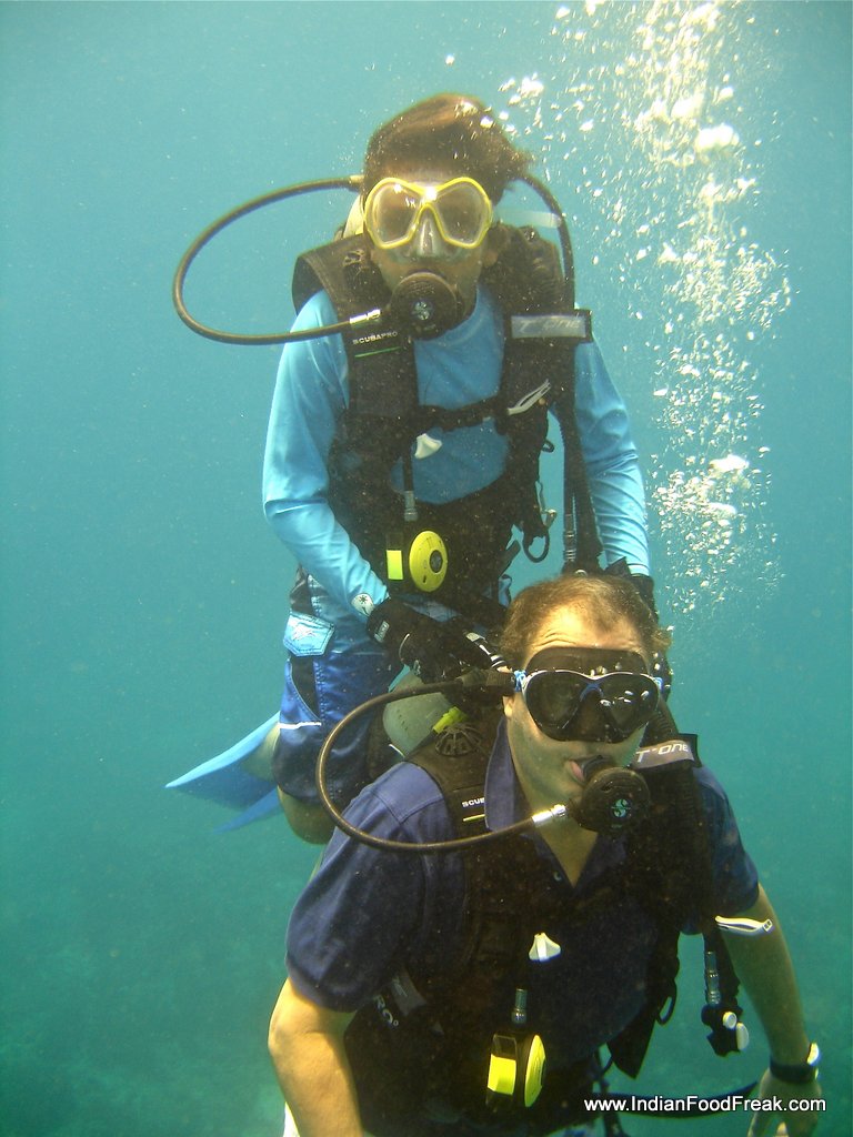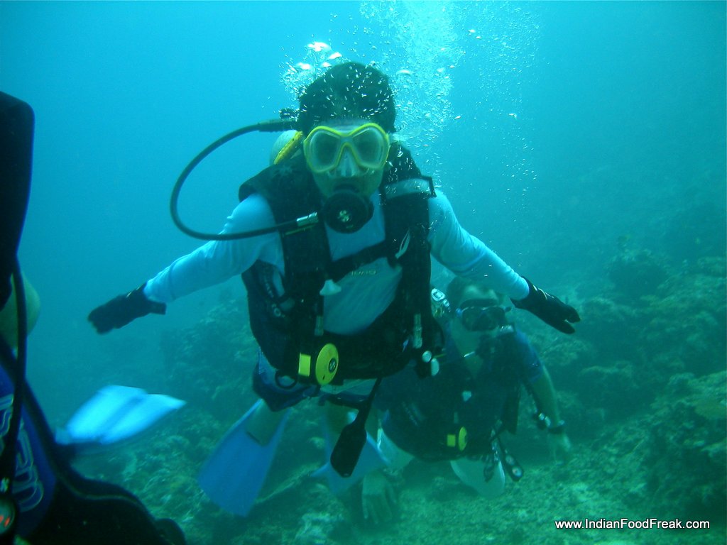 DSCN5834I finally did four open water sea dives in three days. As a beginner, the dive was in waters not more than 10 metres, as at that depth a panic-stricken diver may surface at any time without fear of decompression. My son had a diving instructor all to himself and I was surprised to see that not only did he not have any fear but dispelled any of mine by following all the diving instructions to a T. The lady diving instructor informed me that when she first learnt to dive she too didn’t know to swim and she learnt it only subsequently. That was encouraging news for me.
