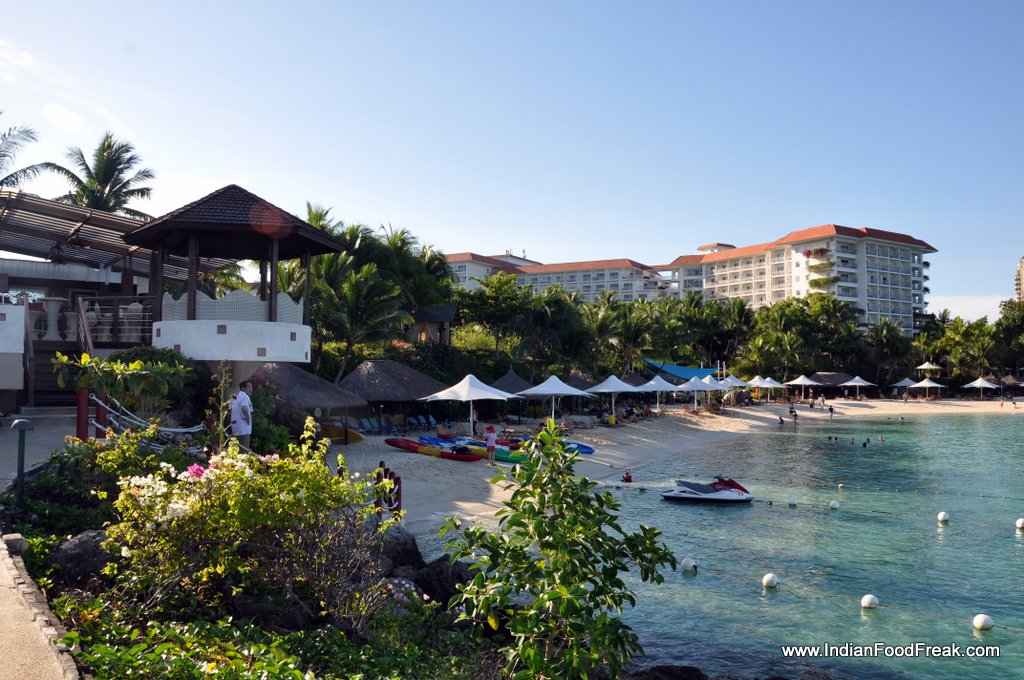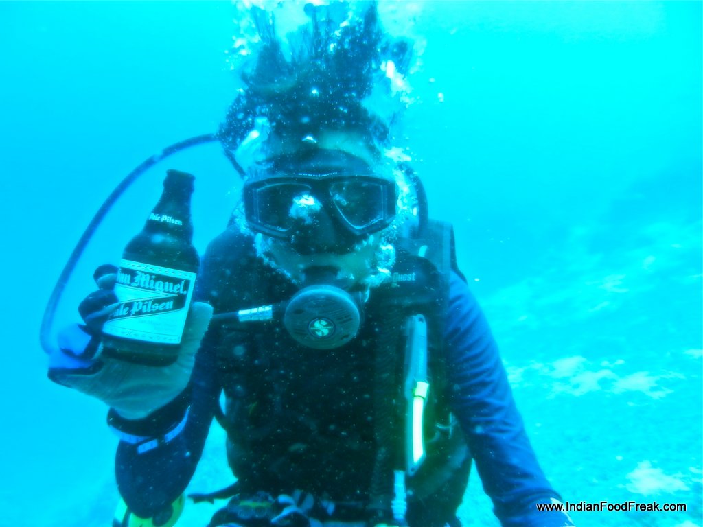 The grilled seafood platter at the resort’s seaside restaurant serving up crabs, lobster, crayfish, jumbo prawns, oysters, clams, fish, squids was a veritable king’s repast at not so kingly prices. The fish, the Philippino Milkfish it was, was delicious. Throughout the dinner, my son was feeding the fish that were teeming in the water below with bread that the restaurant supplied endlessly. Food was exceptionally good at the resort but I drowned myself in tender coconut water, the nut cut up and served with a straw and a spoon to scoop out the tender flesh. Delectable! So was the fresh lemonade made of the Philippino lime called Calamansi. While having the right tangy acidity, the fruit imparts a spiky freshness to the palate. Last but not the least, a bottle of ice-cold San Miguel pilsner, the famous beer that not many Indians know, is from Philippines.