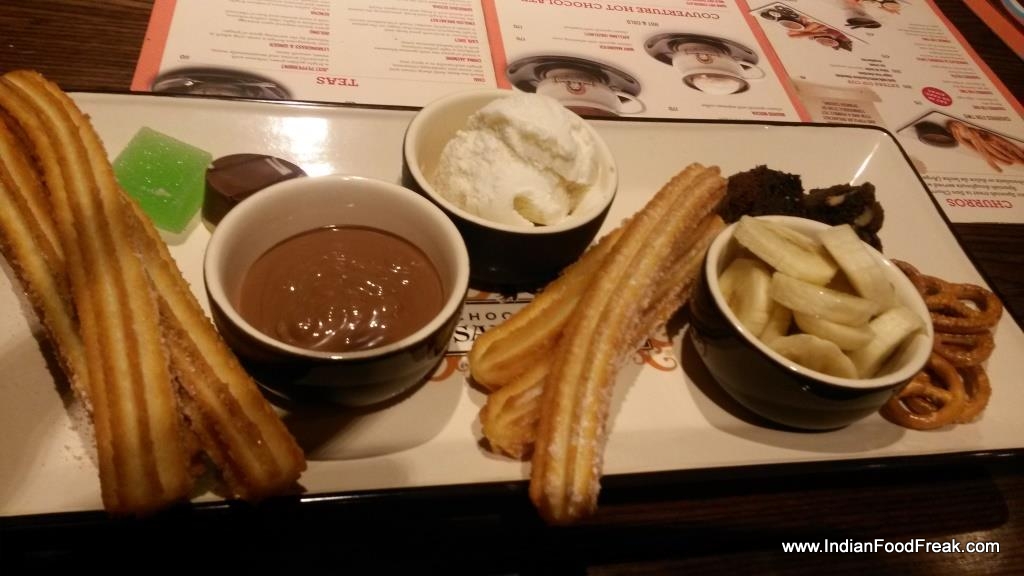 San ChurrosHowever, last week post my kids’ classes, we were hunting for a lunch place to go and happened to pass by San Churros and needless to say, immediately stopped and went inside. On entering the premises, we were taken aback at the chocolaty décor of the place and the laid back ambience. The aromas of dark chocolate were lingering thickly in the atmosphere indoors and we were suddenly hungrier than we had realized. However on approaching the food display unit we were quite put off by the lame display on the counter. There were only 6 sandwiches – 3 veg and 3 non veg, totally forgettable, sorry looking fare. When we asked the staff, we were told that the delivery for the day was done and that is all they had for food. Disappointed, we headed to the Alfredo’s next door in hopes for a thin crust wood oven pizza but were swooned by the cheese fondue offering of the place.  Much to our chagrin, it was a sorry affair with soggy vegetables and cheese which felt completely out of place in the fondue bowl. We finished the fondue half-heartedly and like kids walked back to the San Churros next door for the chocolatey desserts.