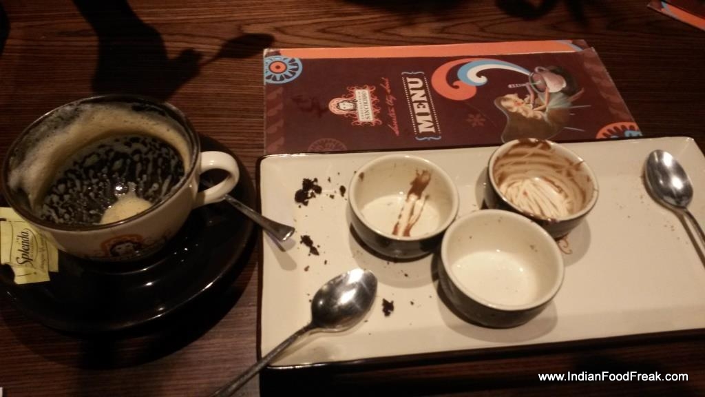 Spanish Mocha 3Usually I am quite disappointed at the dessert section of most of the sit down restaurants as they are generally clichéd and hard on innovations. However, of late I have been quite impressed with the abundance of dessert specialty places like Theobroma, Le 15 Patisserie and off course Chocolateria San Churros. This has opened up a whole new panorama for me post lunch…I can rather settle for a plain Jane meal, but my desserts have to be decadent (perhaps that’s the bong genes in me claiming their just desserts).